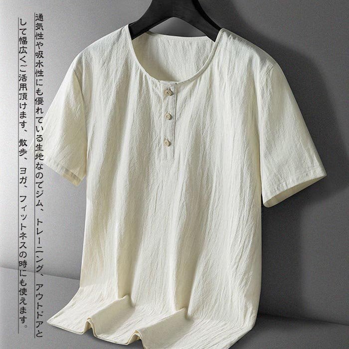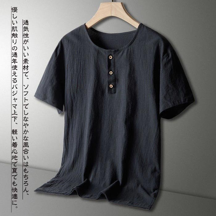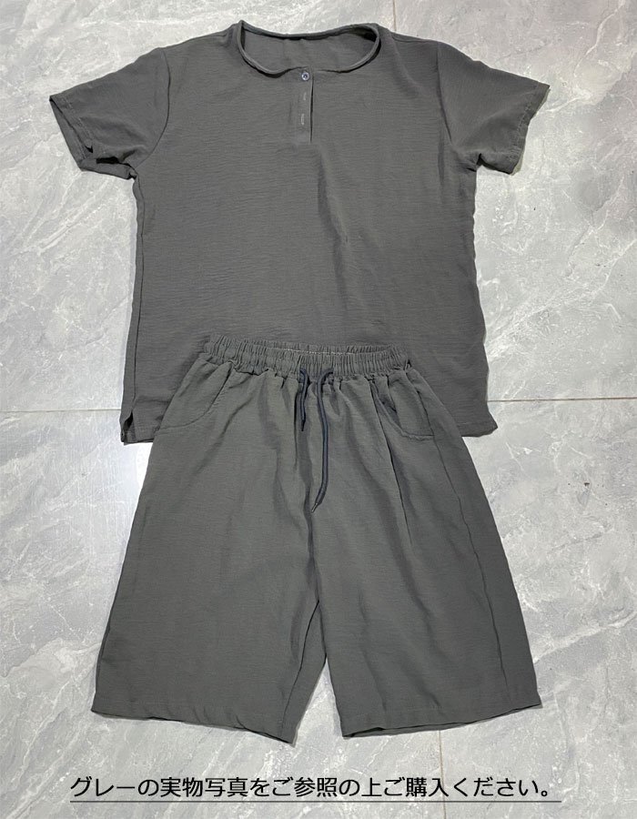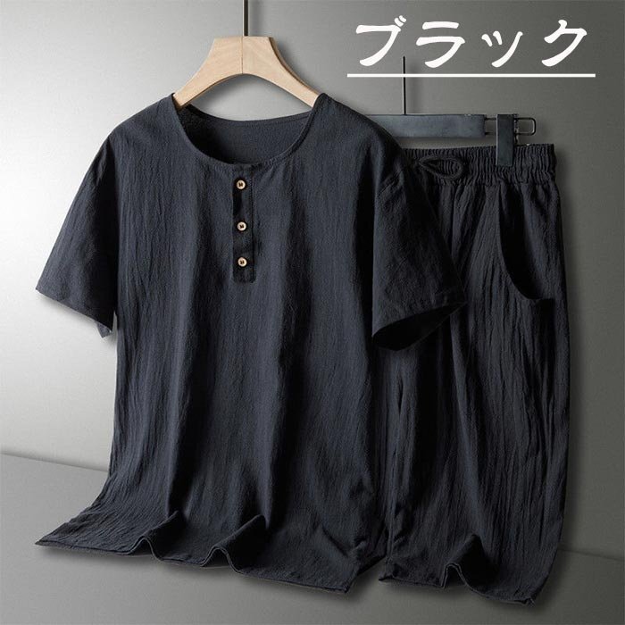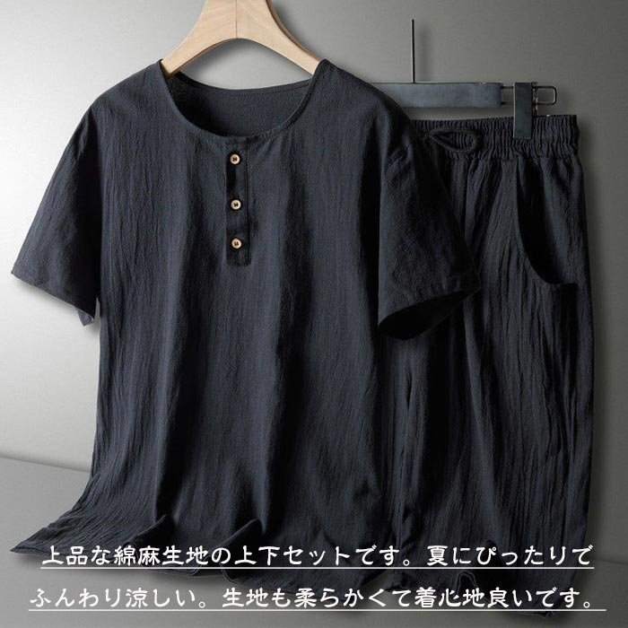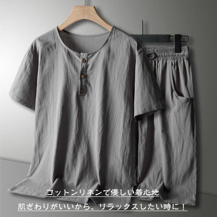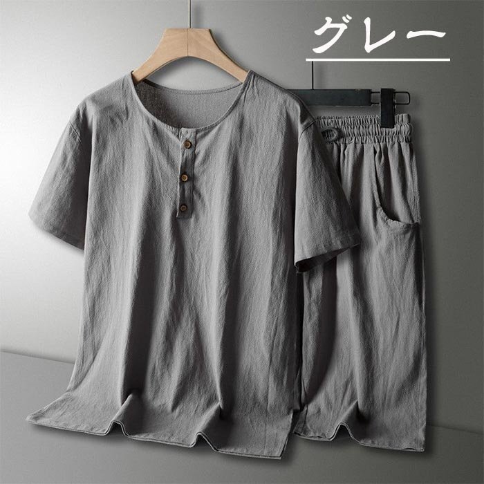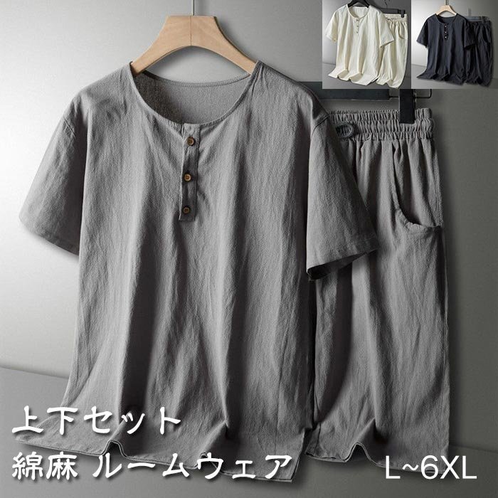 メンズ ルームウェア パジャマ セットアップ Tシャツ+半パンツ 上下セット 部屋着 スポーツ 無地 綿麻 リネン 半袖 ☆3色/L~6XL選択/1点