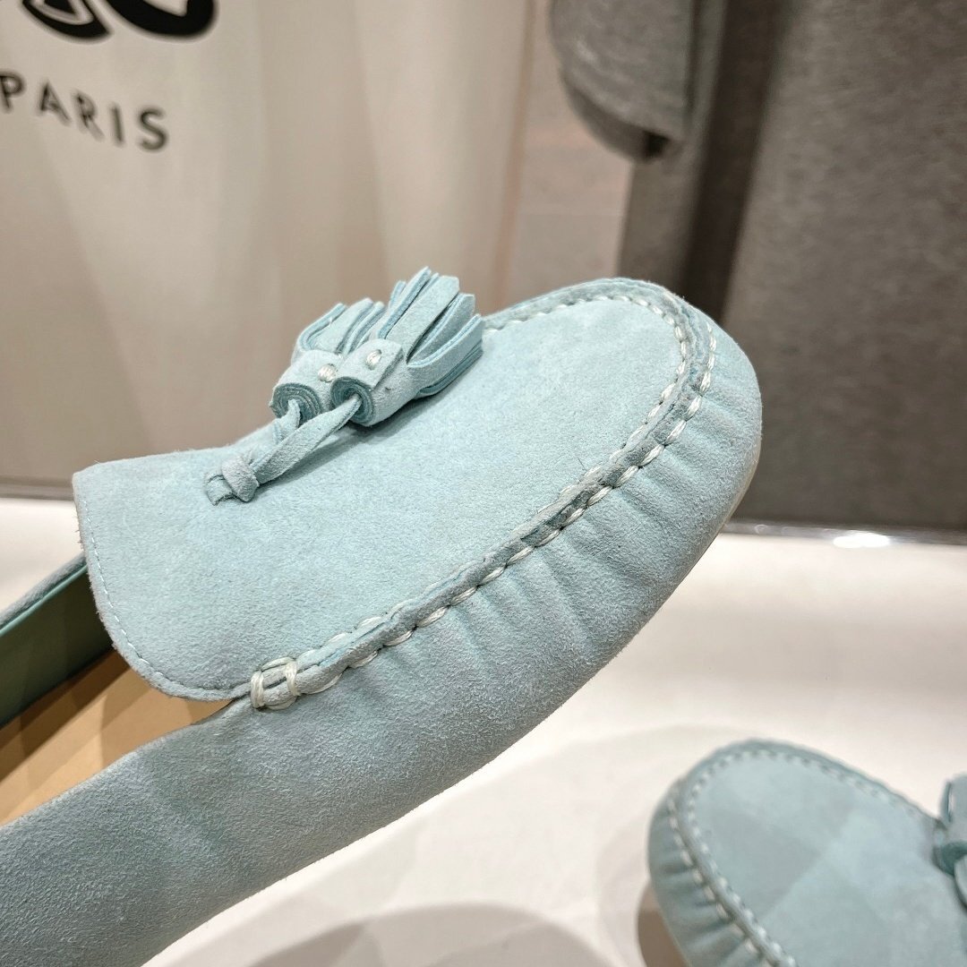 洗練された夏のドライビングシューズ、Loro Pianaのサマーウォークコレクションからお届けします。上質なタンカラーのスエードレザーを使用し、職人技が光る手作りのタッセル装飾が特徴です。足に優しい水染め羊皮の内張りと牛革のインソールを採用し、快適な履き心地を実現。軽量で耐久性のあるホワイトラバーソールは、長時間の歩行でも疲れにくい設計です。モカシン構造により、スムーズな脱ぎ履きが可能で、カジュアルからセミフォーマルまで幅広いスタイリングに対応します。丁寧な縫製と高品質な素材使用により、長くご愛用いただける一足です。サイズ選びの際は、通常のサイズをお選びください。