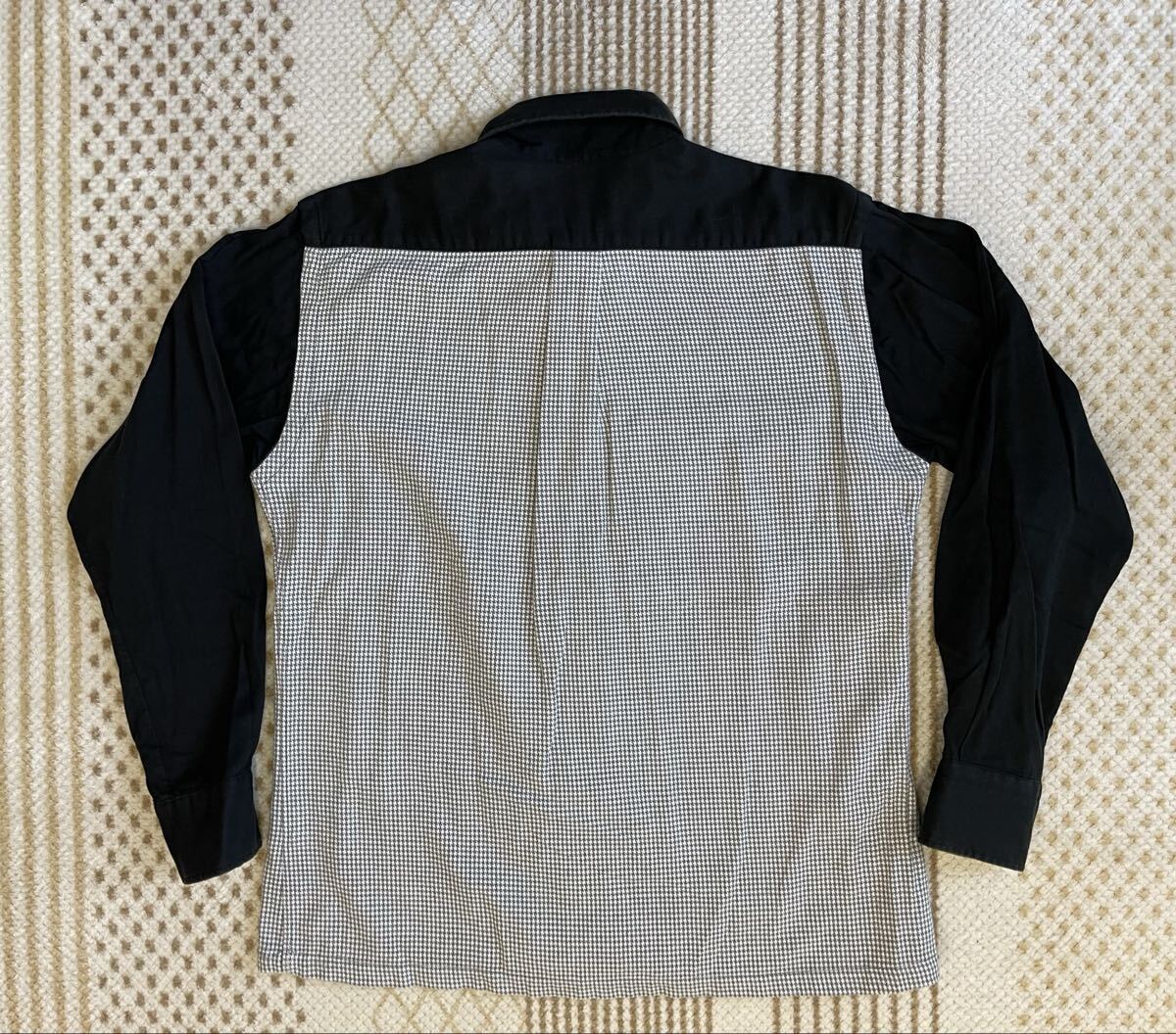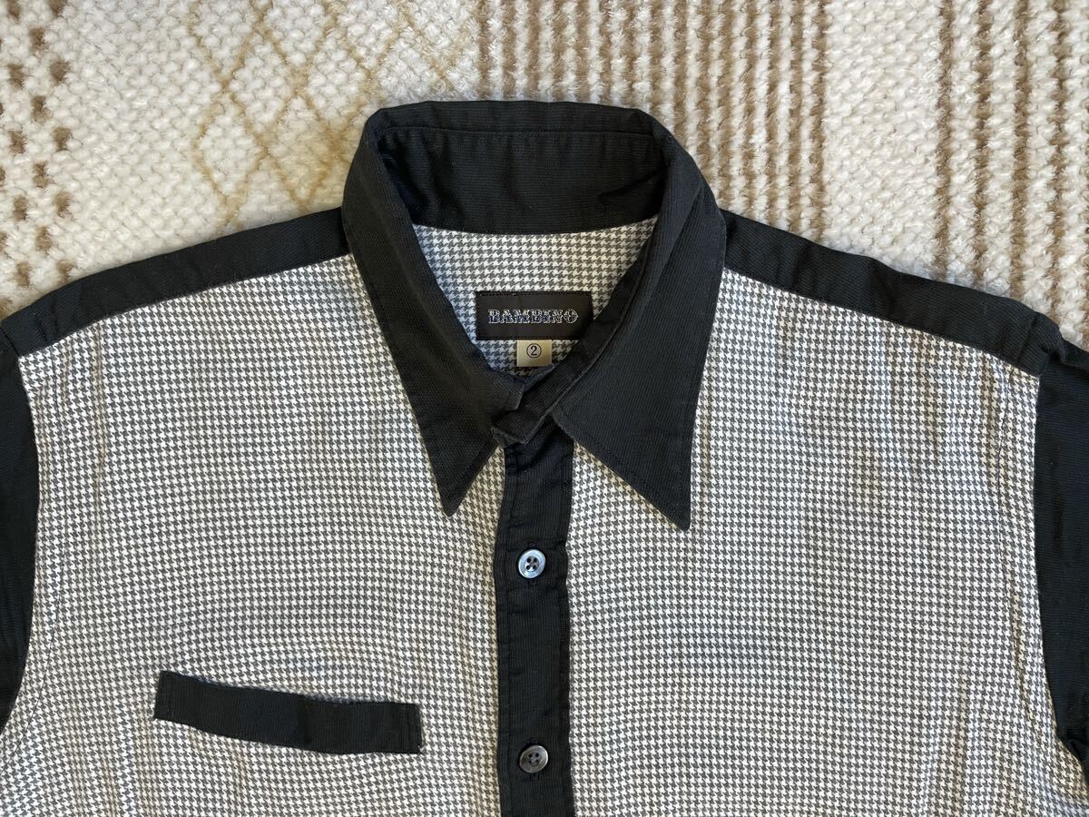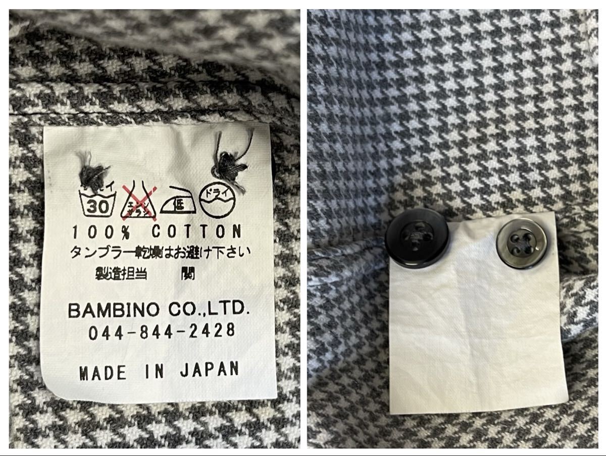 BAMBINO CO.LTD.(株式会社バンビーノ)が製造した、千鳥格子(ハウンドトゥース)柄と黒無地を大胆に切り替えたデザインが特徴の長袖シャツです。一般的なシャツと異なり、ポケットは右胸にのみ配置されています。黒い無地の生地が横一文字に施されたデザインポケットで、ブランドの個性的なデザインが光ります。