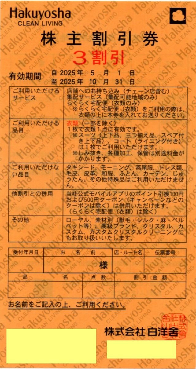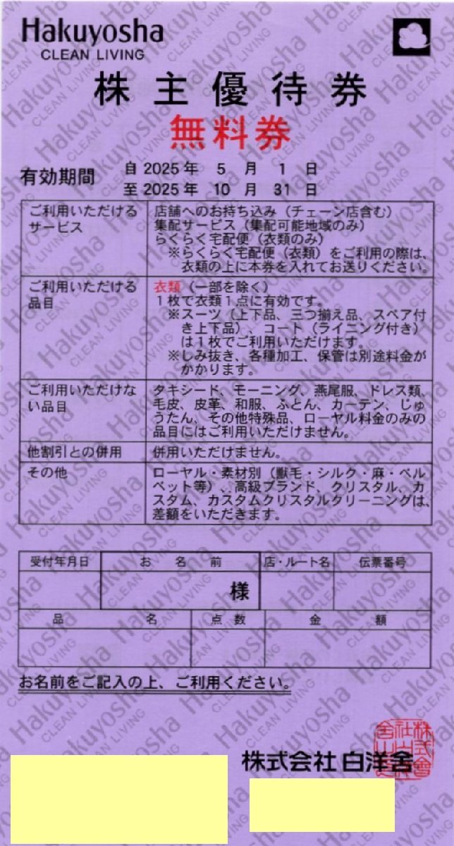 ☆. [合計5枚セット] 白洋舎 株主優待券 クリーニング無料券x2枚+3割引券x3枚 2025/10/31期限