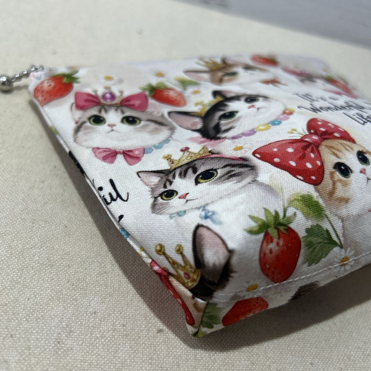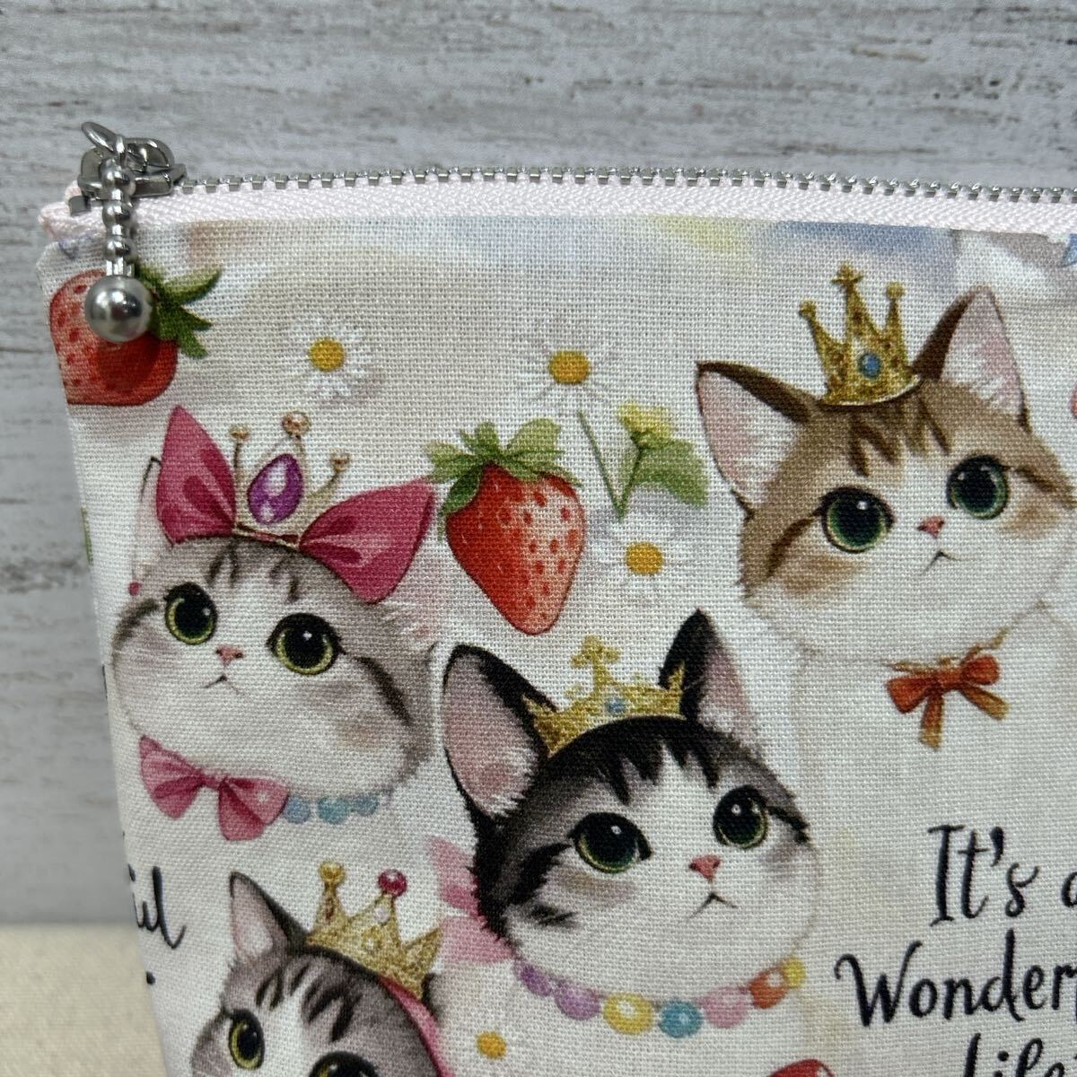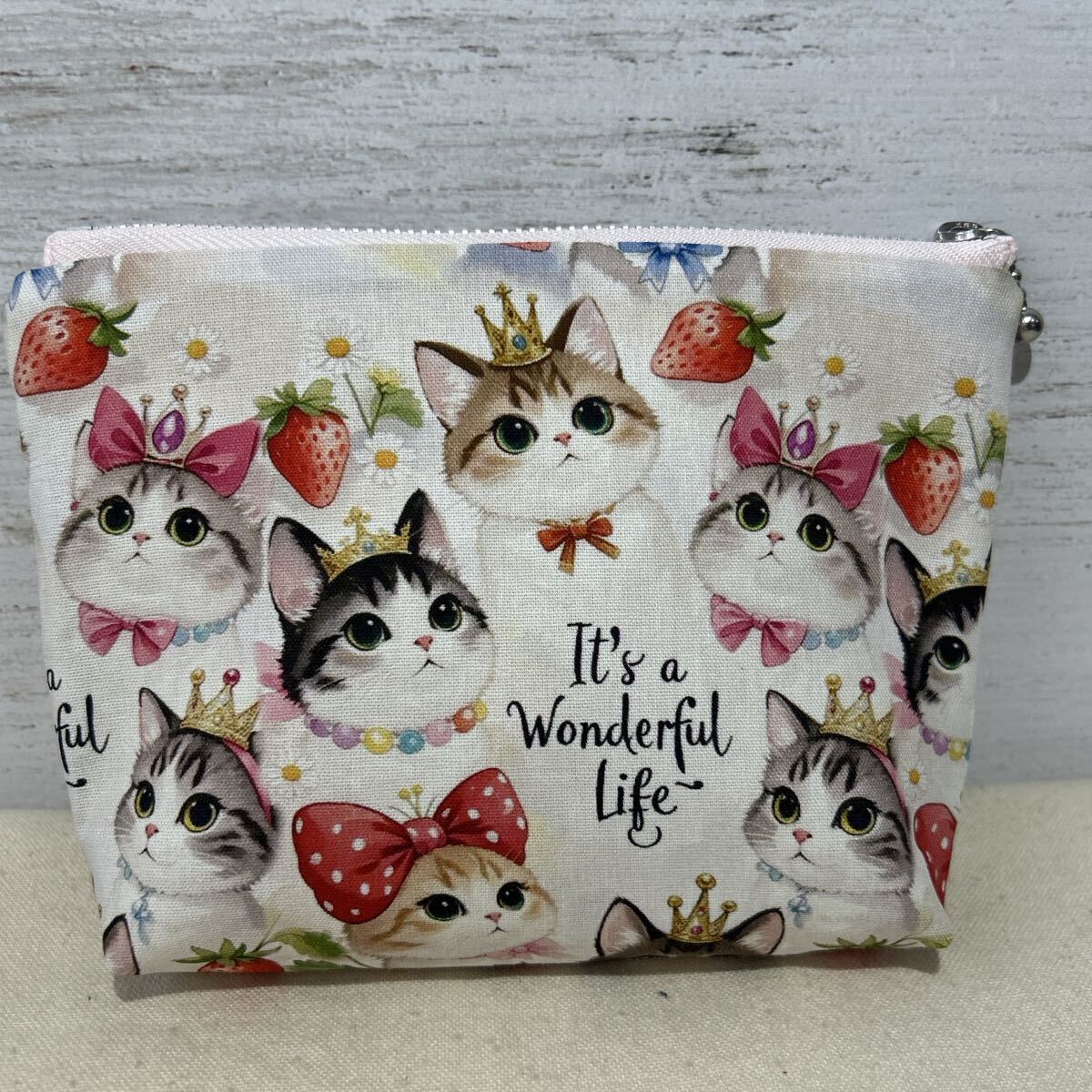 ポーチ/ハンドメイド /コスメポーチ/小物入れ /16cmポーチ/ 苺王冠猫4