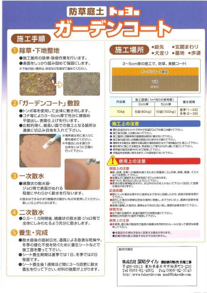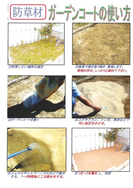 | 【防草庭土 固まる土 ガーデンコート10kg×20袋=200kg ブラウン】 防草庭土 固まる土 ガーデンコート 舗装の土 10kg×20袋=200kg お急ぎの方は質問より在庫・納期の確認をお願いします。 ガーデンコートは暮らしに楽しさと快適空間を演出します。 「家族、友人とガーデンパーティーを開きたい」 「愛犬を放し飼いにしたい」 「子供を遊ばせたい」etc・・・ みなさまの暮らしを豊かに彩る「使う庭」づくりを実現する防草庭土です。 10kg袋の単品・60袋/6袋セット品もあります。→ 【出品中の商品】