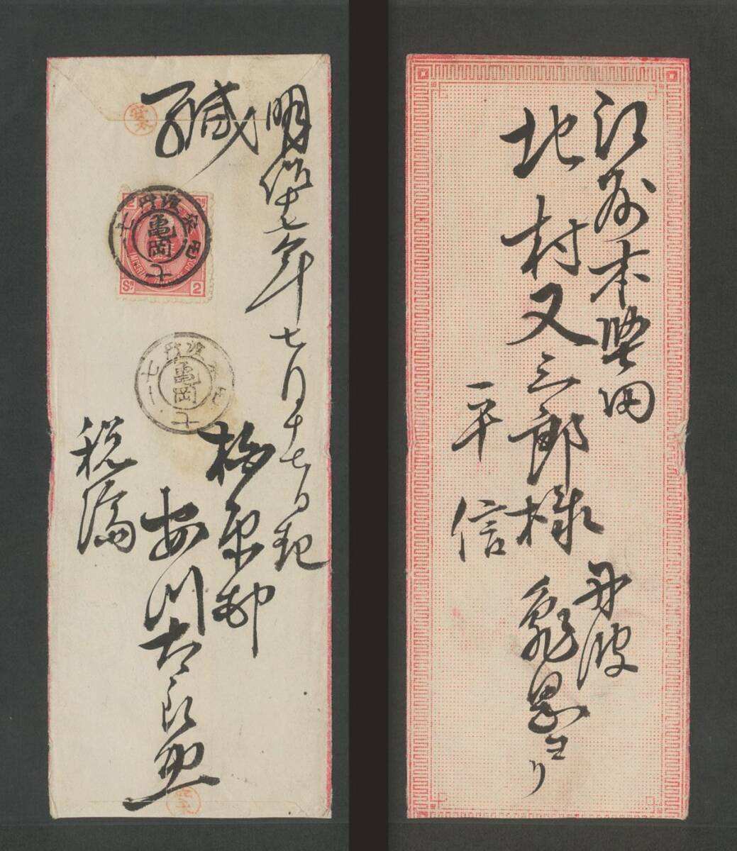 日本実逓カバー U小判 2銭 木綿紙10 紅 単貼 二重丸型日付印 KG丹波亀岡7.17 →着印なし (17年書き込み) 下辺~右サイド下L字に開封