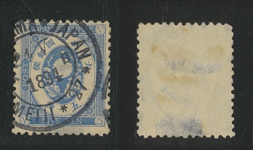 日本切手 使用済 U小判 5銭 後期13 二重丸型日付印 明治(YOKOHA)MA ゴム印 青 下面中央破れ、ヘゲ有