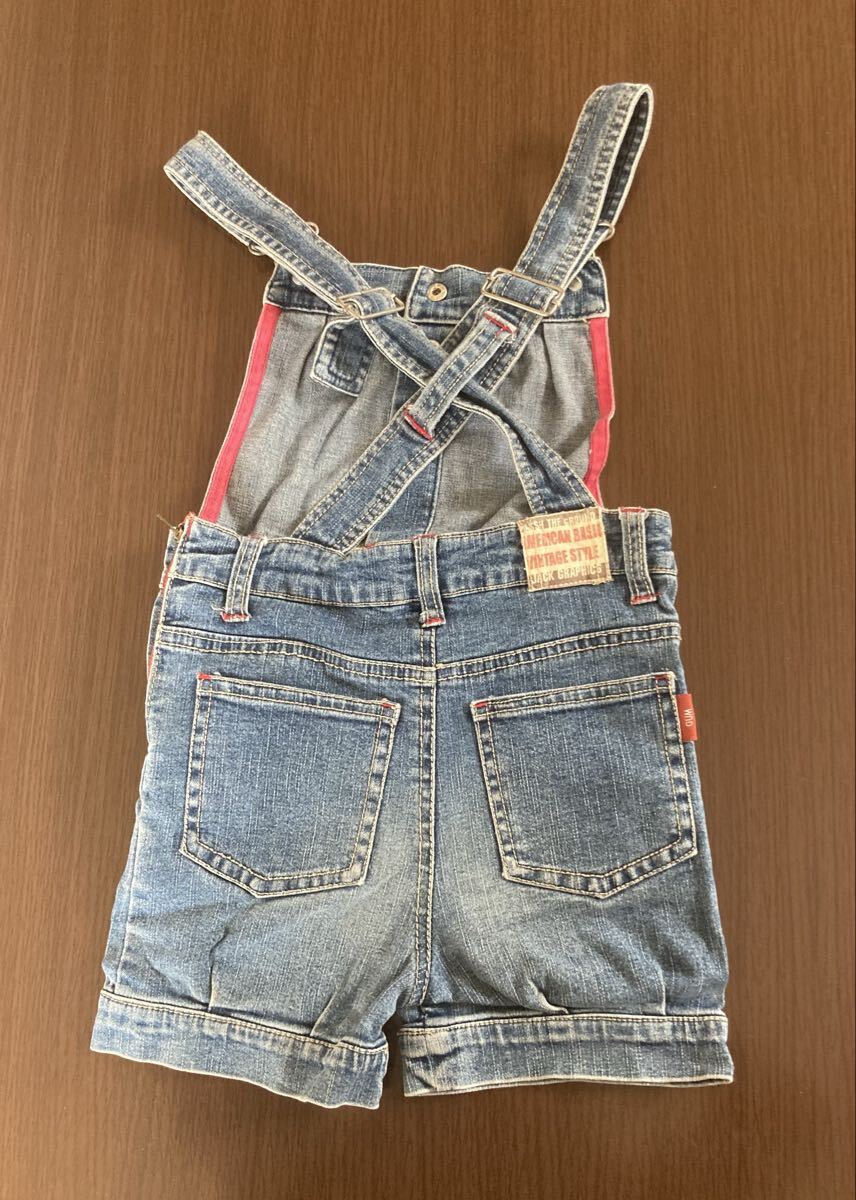デニムのオーバーオールでポケットが前と後ろにあり前ポケットの中にも落ちないようにポケットがあります。
