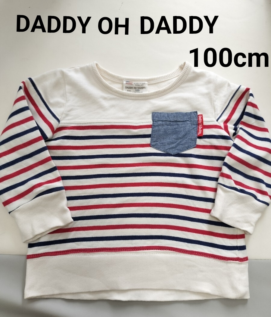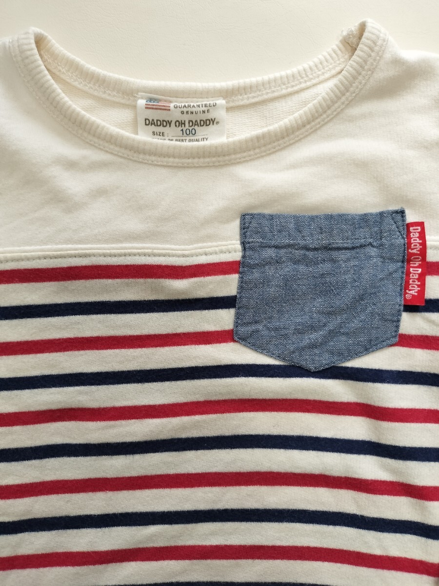 ホワイトをベースに、ネイビーとレッドのボーダー柄が特徴的で、胸元にはデニム素材のポケットが付いています。カジュアルで可愛らしいデザインで、普段使いにぴったりです。