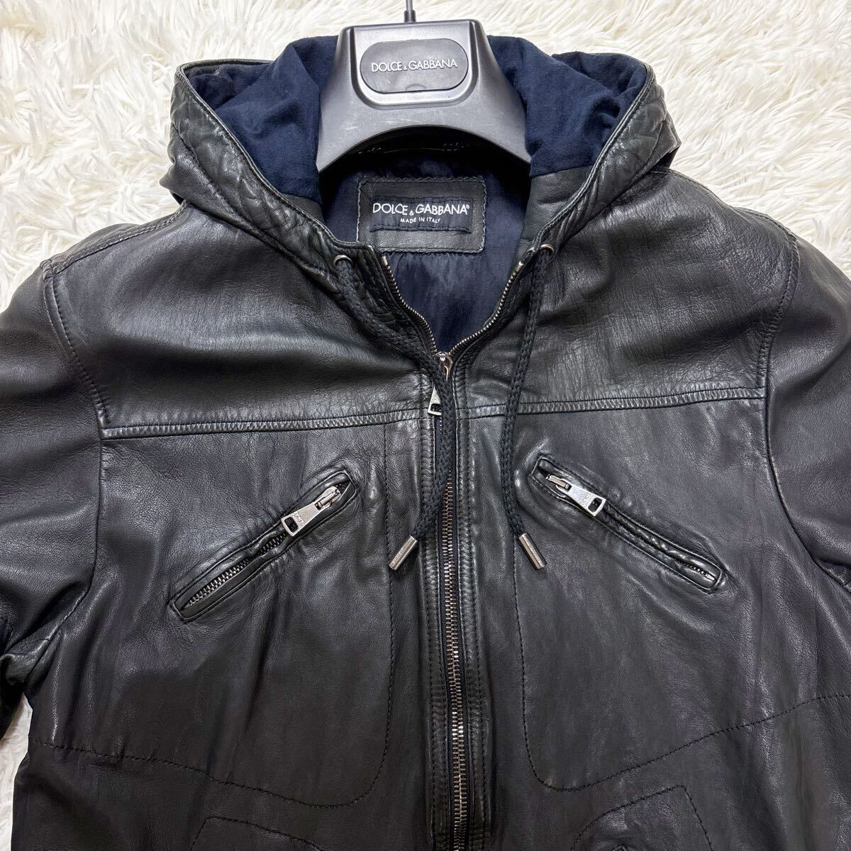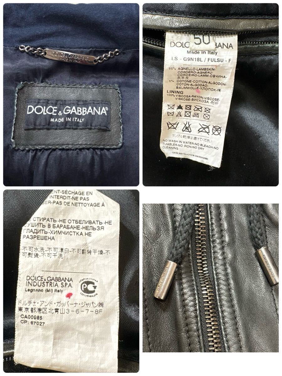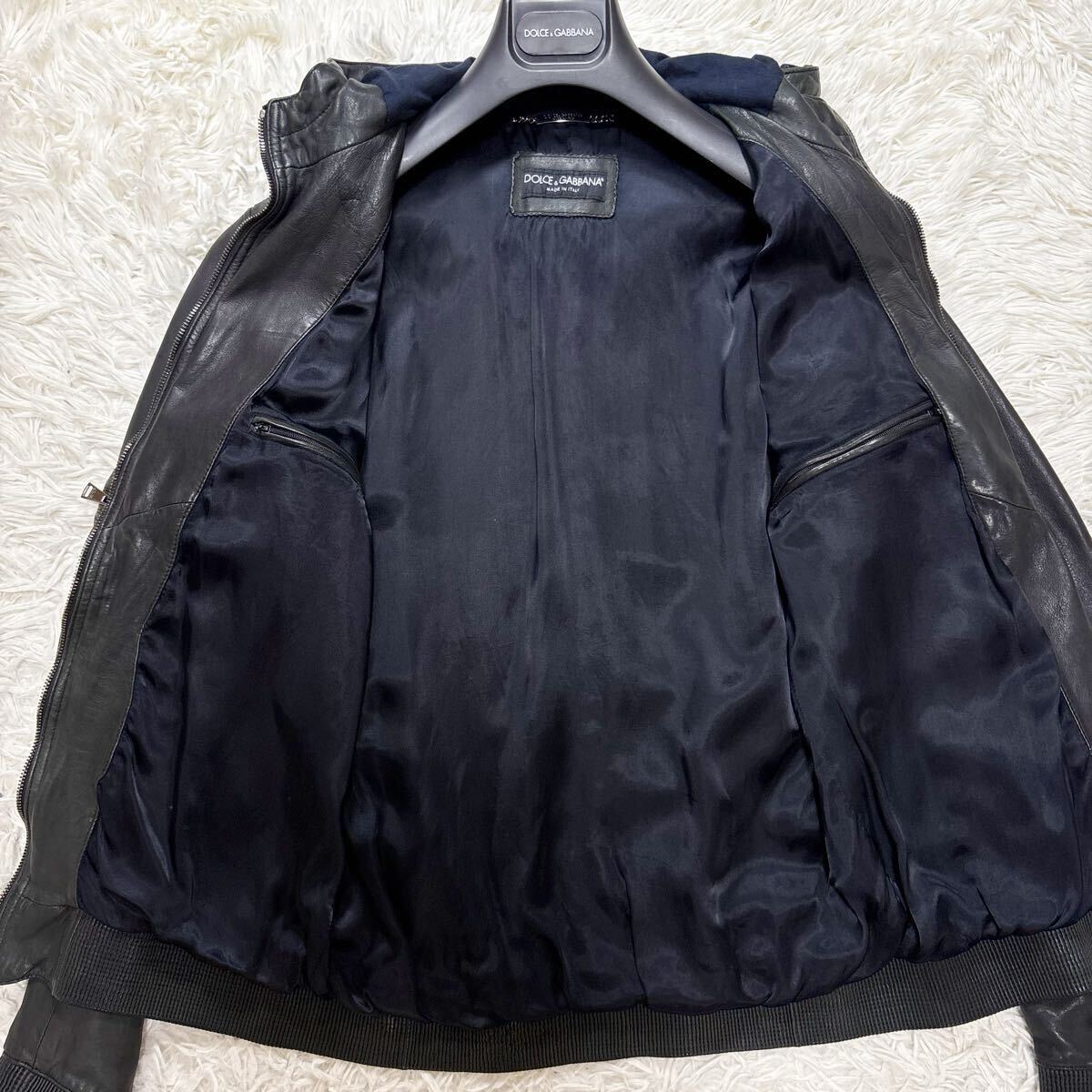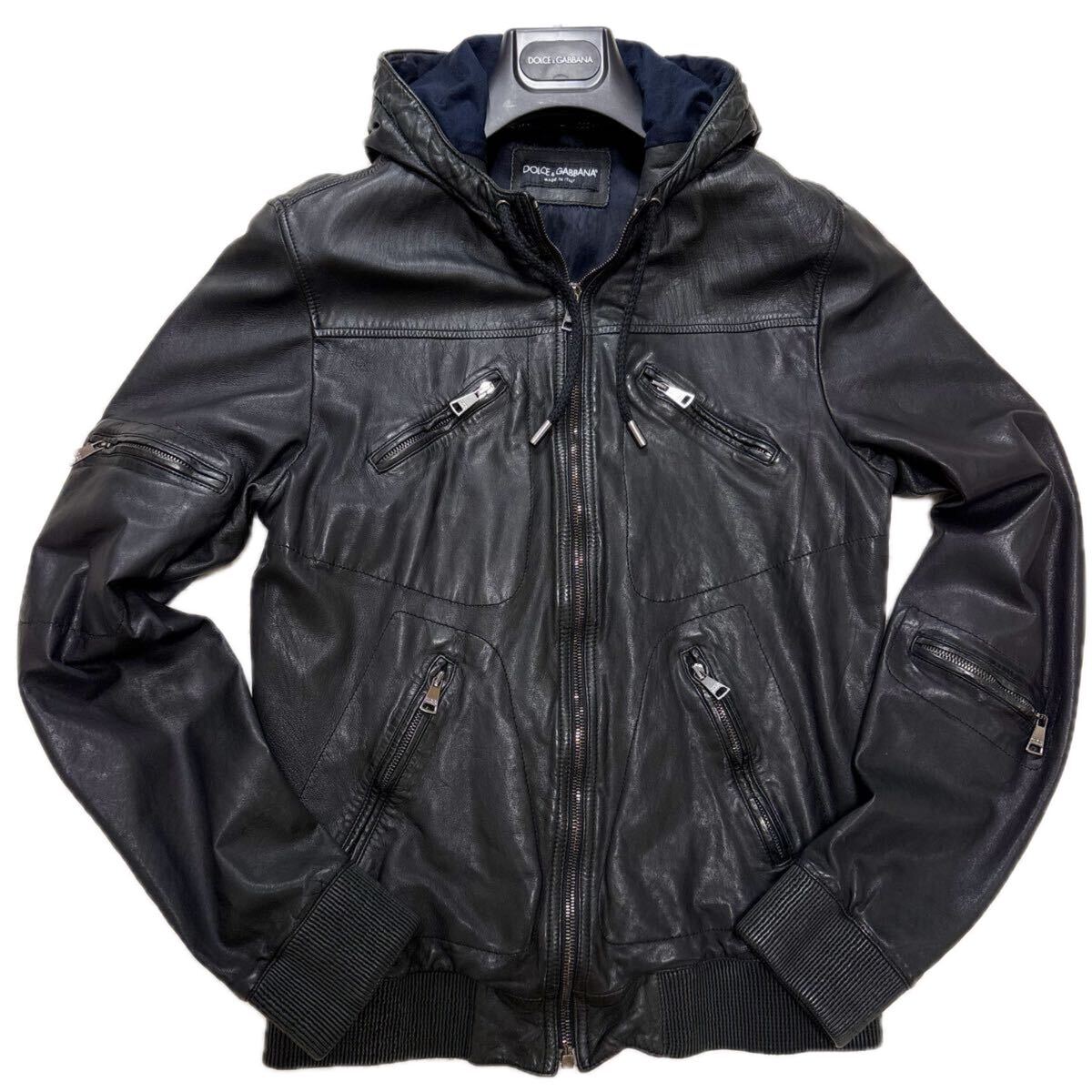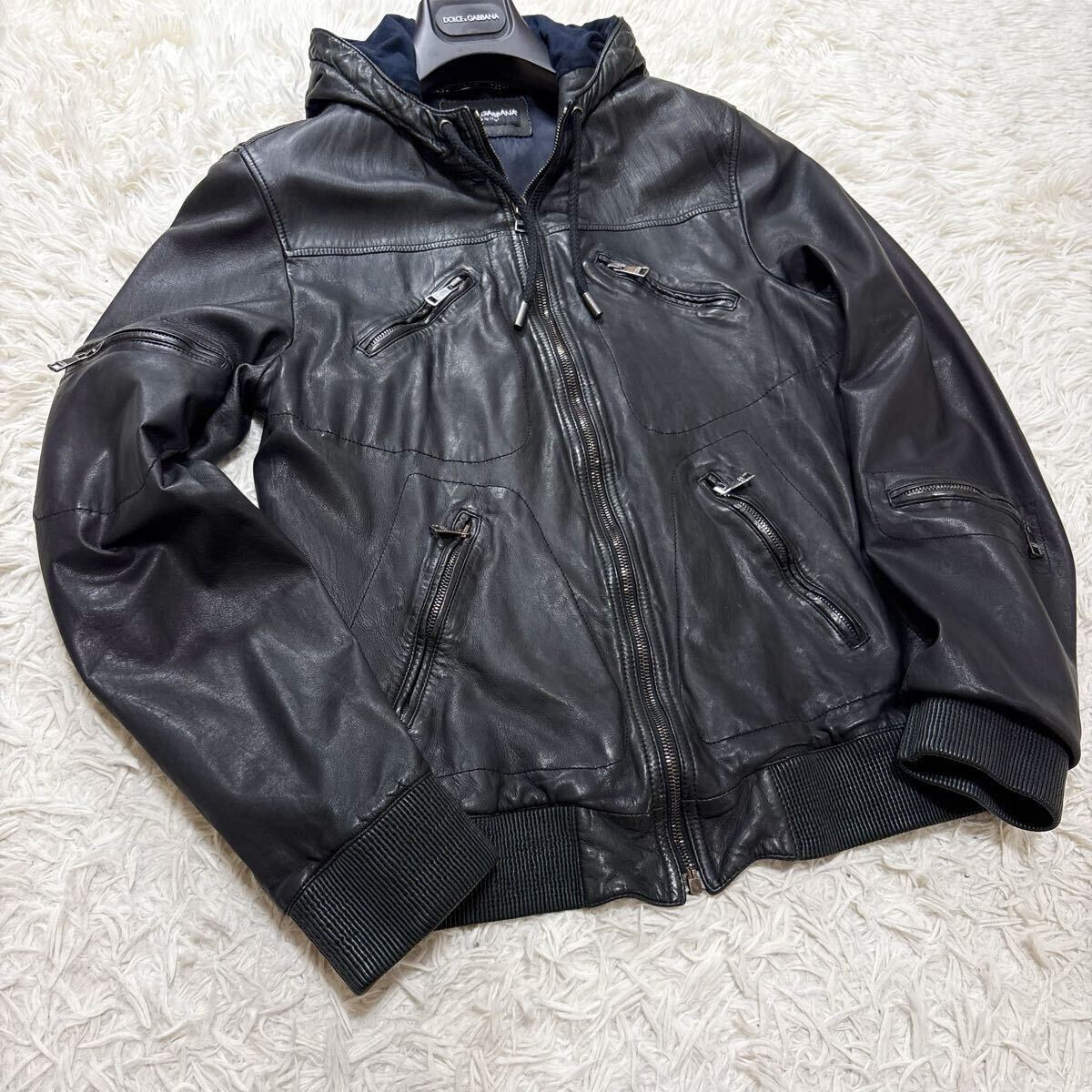 希少 XL相当 ドルチェ&ガッバーナ ラムレザー パーカー 八の字ZIP レザージャケット ブルゾン ブラック 羊革 ドルガバ 50 DOLCE&GABBANA