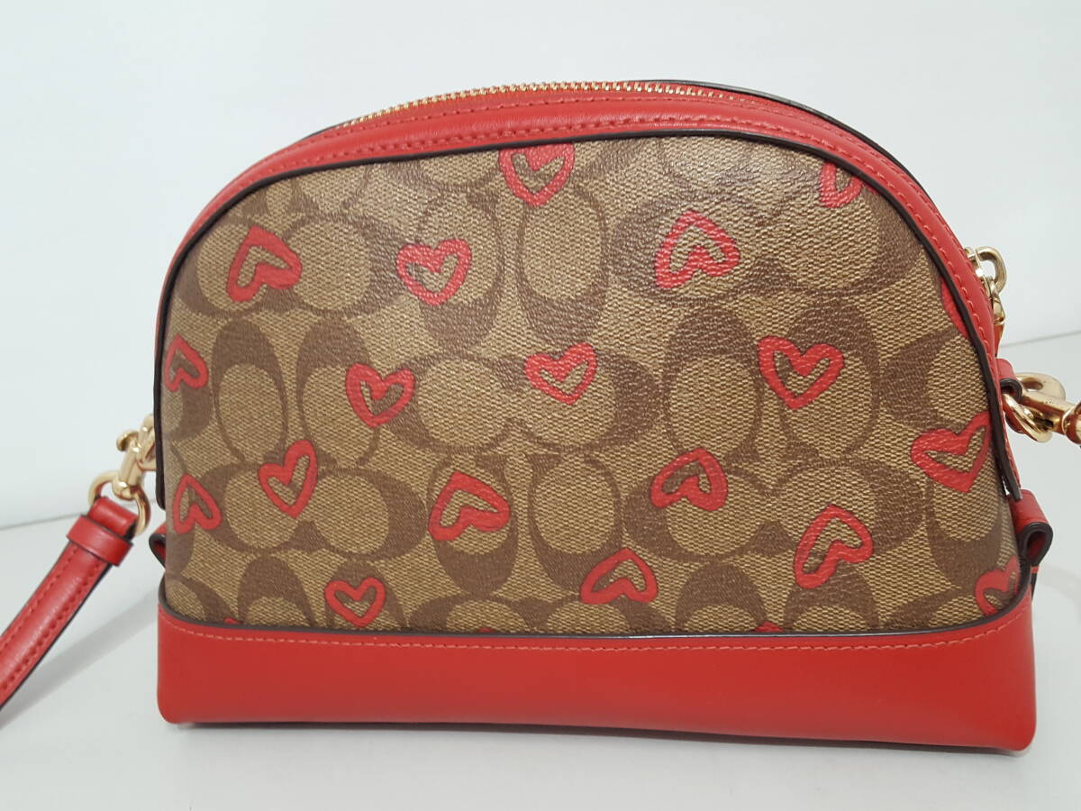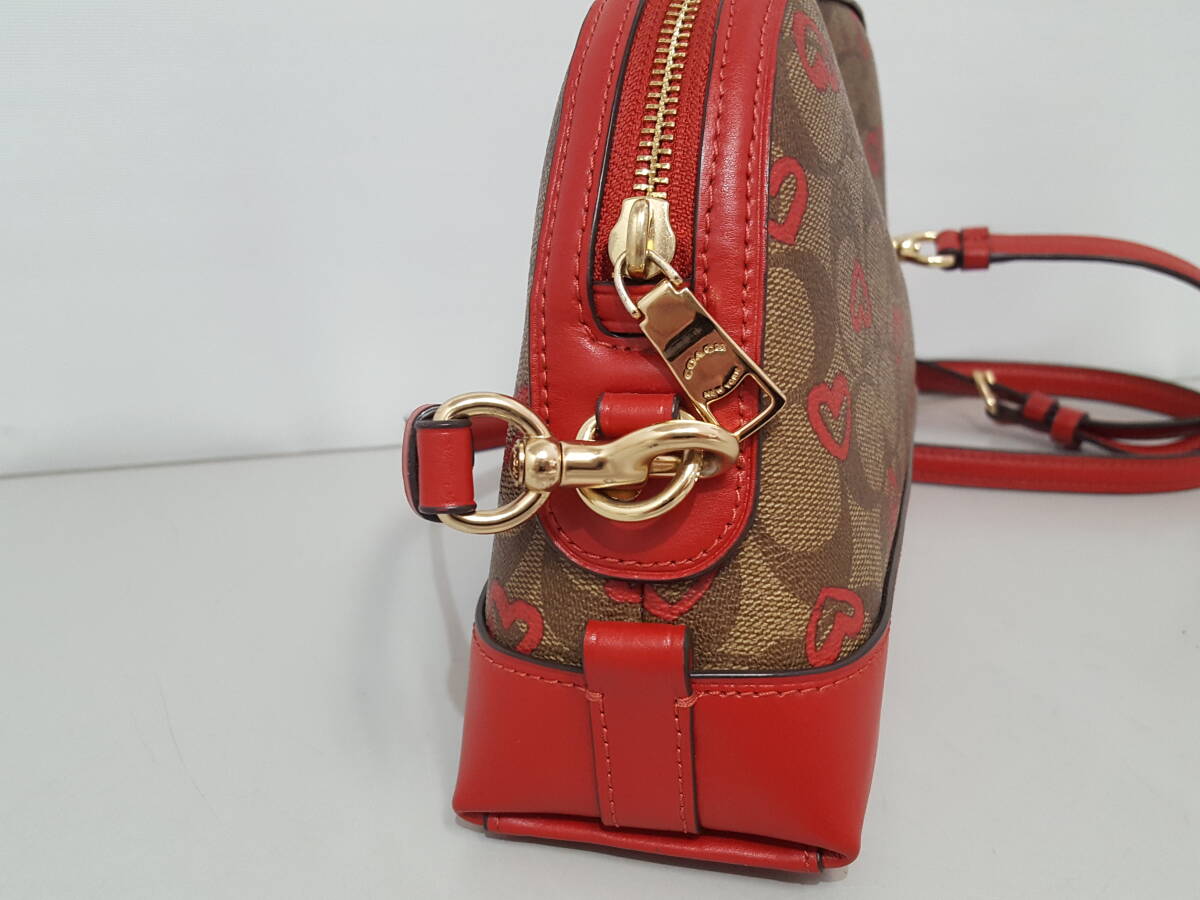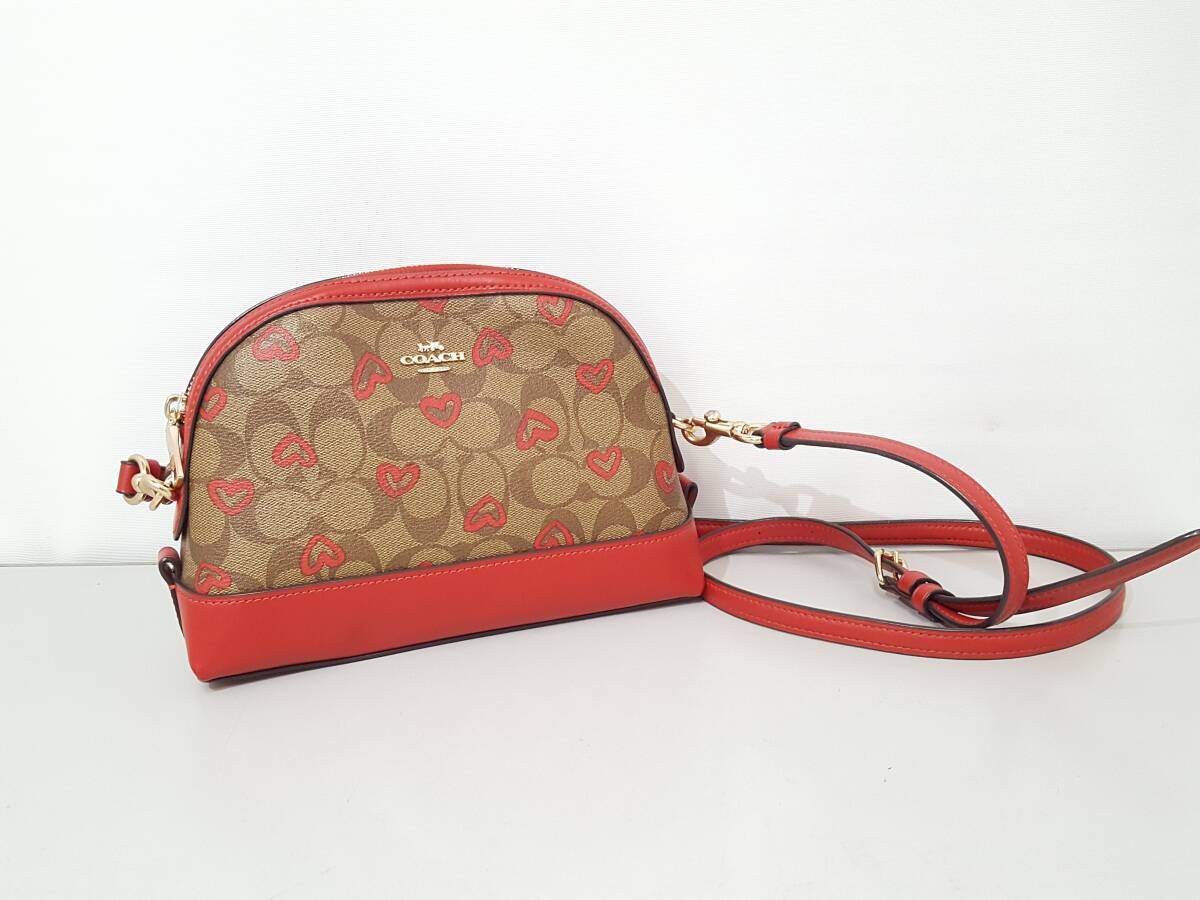 ※離島など別途中継手数料がかかる地域が御座います。 その場合はお振込みを追加でお願いする場合が御座います事、 事前にご了承の程、宜しくお願い致します。 ※送料には業者指定された運送用梱包資材代が含まれます。 専用BOX、段ボール梱包以外での補償は対象外となります。 [商品名] 1円スタート 【美品】COACH コーチ シグネチャー ハート ショルダーバッグ 91015 [サイズ] 高さ約17cm, 横約23cm, マチ約6cm, ショルダー長さ約120-138cm [素材] 本革レザー×PVC他 [カラー] ブラウン系×レッド系 [仕様] ファスナー開閉仕様 フリーポケット×1 [状態] 右サイド下部に薄い汚れ、 金属部分にキズ、メッキハガレ箇所が御座いますが、 その他は殆ど傷み無い美品です。