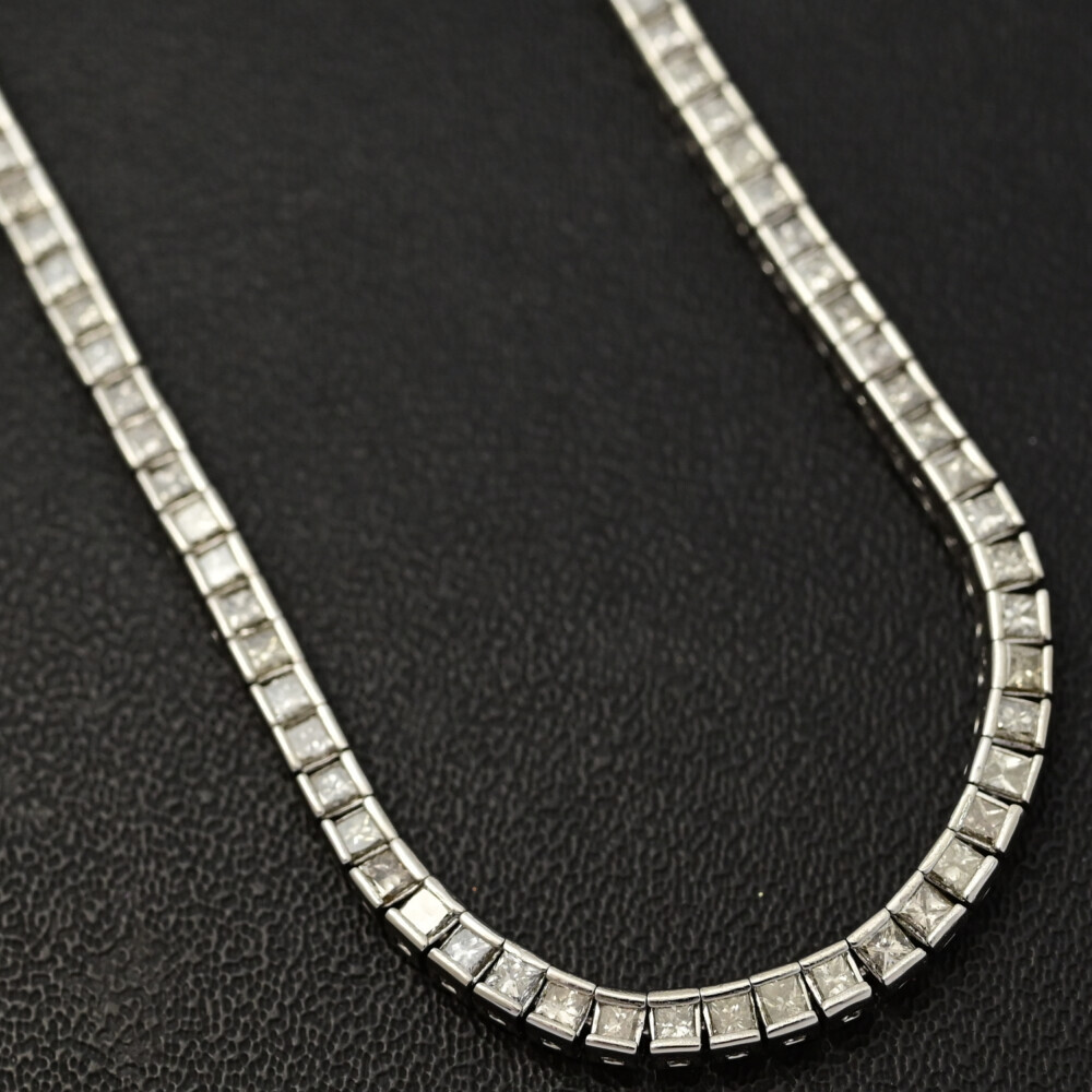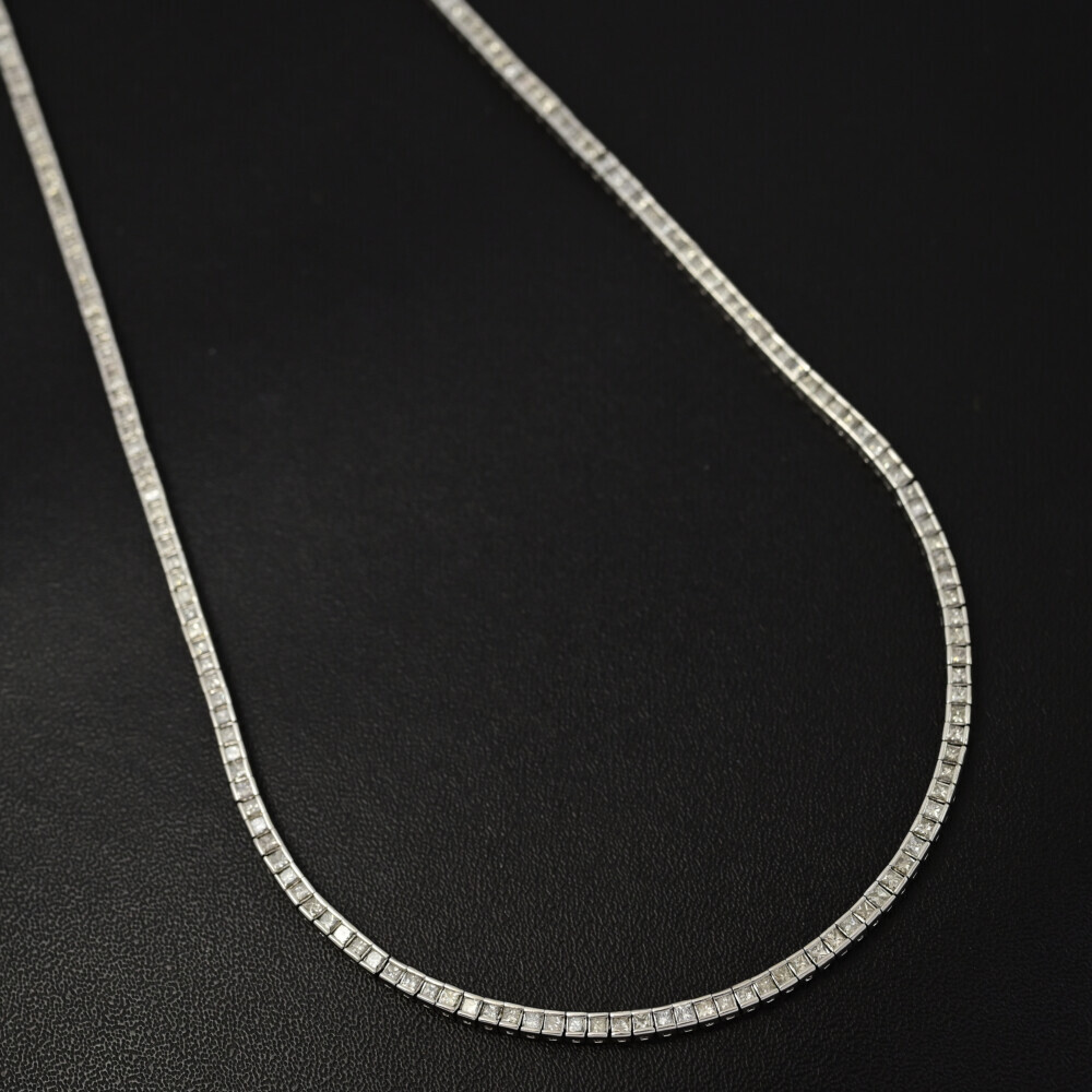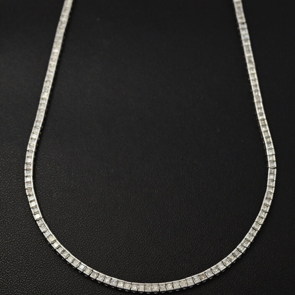 | 実寸サイズ | アイテム名:テニスセッティング グラム:28.9g 親石:5.8ct シェイプ:プリンセス カッティングスタイル:モディファイド・ステップ セッティング:テニスセッティング 処理:天然 [サイズ(以下約)] 親石寸法(H×W 見え寸):1.8×1.8 mm カラー:J クラリティ:I1 ※グレードは弊社見解です カット:Princess チェーン全長:44.0 cm チェーン幅:2.5 mm ネックレス全長:22.0 cm アジャスター:無 |