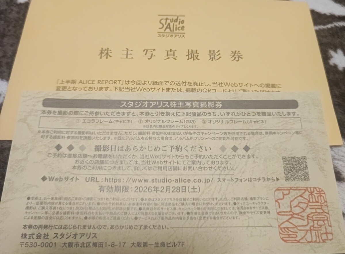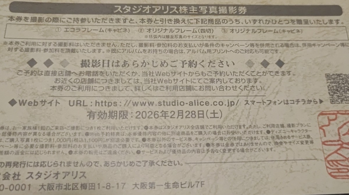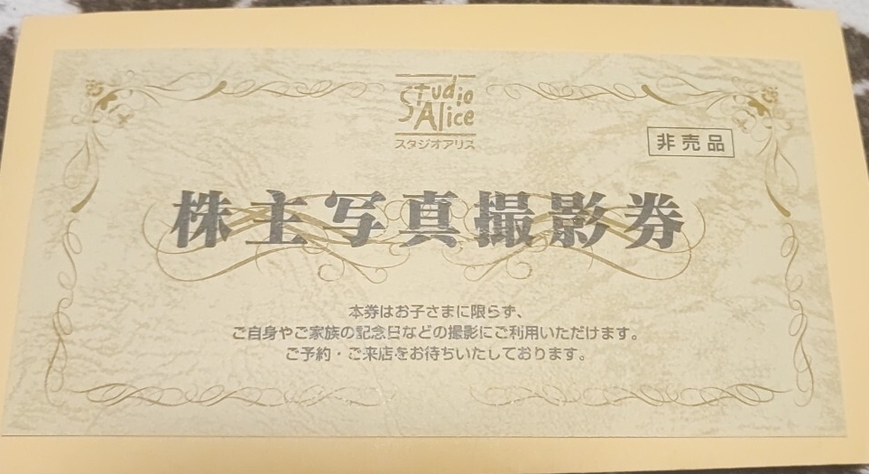 いずれか一つが無料となる株主優待券1枚です。撮影料も不要です。