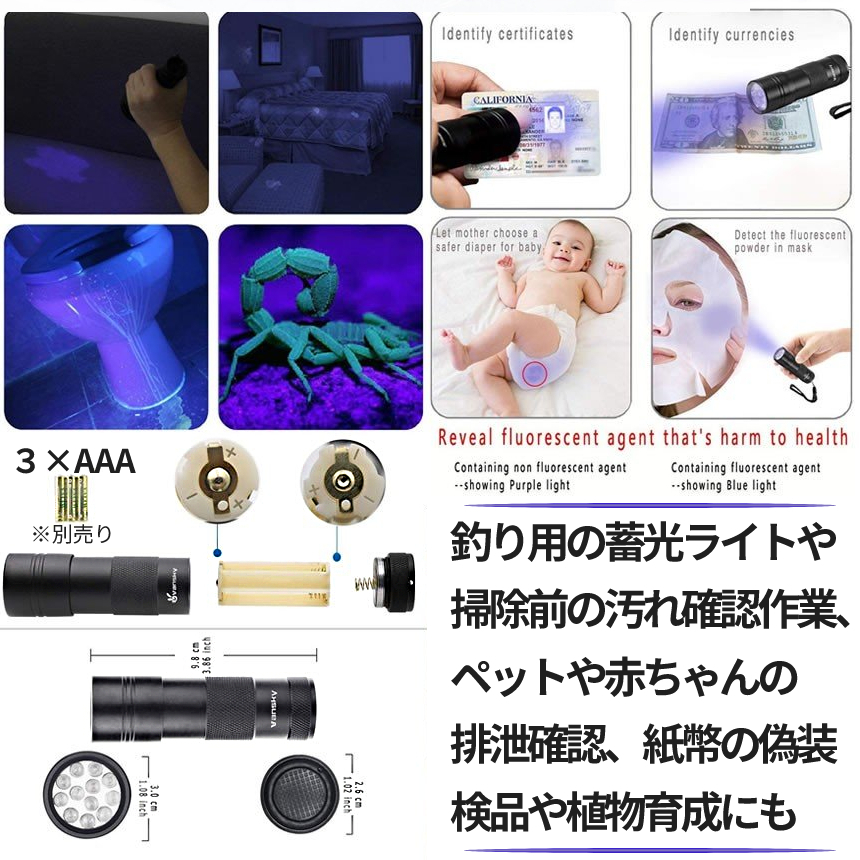 | 送料無料!!! 送料及び下記のご案内をご確認の上、ご入札お願い致します。 離島地域を除く九州、四国、本州まで送料無料。 ※北海道は+1000円、離島地域及び沖縄県は+3000円にて承ります。(発送前に加算) ※画像内にカラー及びサイズ等の選択が可能と記載がある場合がございますが、 お届けする物はタイトルまたは商品説明文に記載の物です。 ★※注文後のカラー変更や異なるカラー・サイズ指定等は一切承っておりません。 ※★※仕様(ロゴデザイン/ロゴ有無等も含む)は予告なく変更する場合があります。 ※多少の汚れや小傷がある場合がございますがご了承ください。 梱包は簡易包装ですので、箱の角落ち等はご了承願います。 【商品説明】 \ ミニチュアUV懐中電灯 / 手のひらサイズで様々なシーンにマッチする 便利な作業用UVライトです。 USB充電式で挿すだけ簡単充電♪ IPX4デザインを采用し日常的に長時間使用するのに 十分な耐久性と表面滑り防止性を備えます。 ペットの尿発見や 紙幣、偽造品の識別時に、 宝石類の亀裂を検査 服や化粧品に蛍光物質等使い方様々♪ ============== 【商品仕様】 素材:アルミニウム合金 サイズ:全長9.6×ヘッド外径30×グリップ外径26mm 重量:75g 本体カラー:ブラック ※バッテリーは別売りです ※日本語説明書は付属しておりません ※輸入品ですので多少の臭いやスレ傷、汚れはご了承ください ※サイズは実寸ですが若干前後する場合がございます ※お子様の手の届かない場所で保管してください ============== ※詳細は画像にてご確認ください ![]() ![]() ![]() ![]() ![]() ![]() |