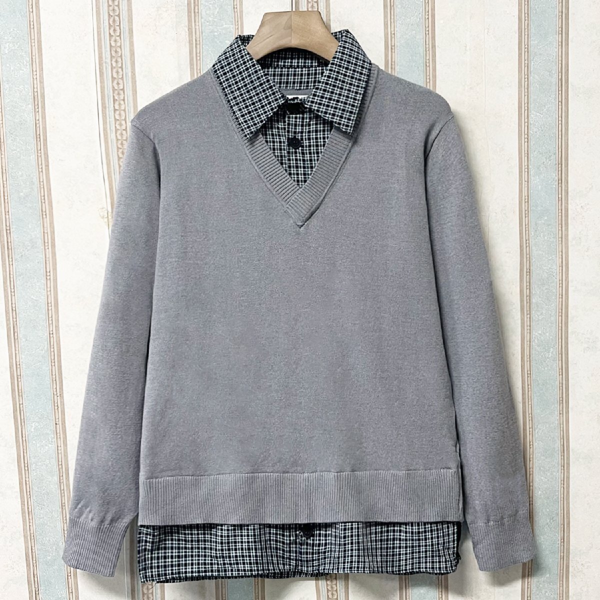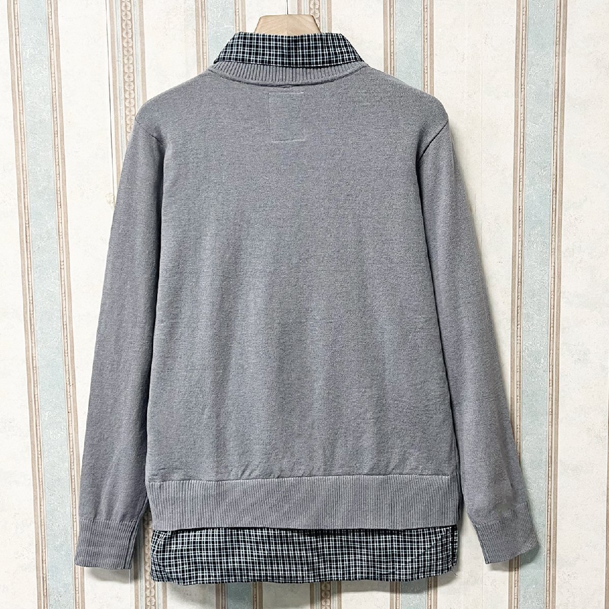 シャツとニットを重ねたようなフェイクレイヤードデザインのセーターです。