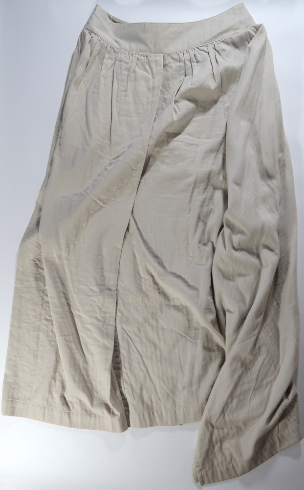 出品は画像の物のみです。使用品ですのでしわ、擦れや汚れはあるかと思いますが、特に酷い傷や目立つような汚れは無いです。サイズはスカート丈は81cmくらいです。スカート丈はちょうどボタンのある部分から直線で測っています。端の方がよれて垂れるような感じの部分はもっと長いです。この端の垂れ下がっている部分のスカート丈は108cm位有ります。ウエストは70cmくらいです。生地はコットン100%です。製造国は日本です。
