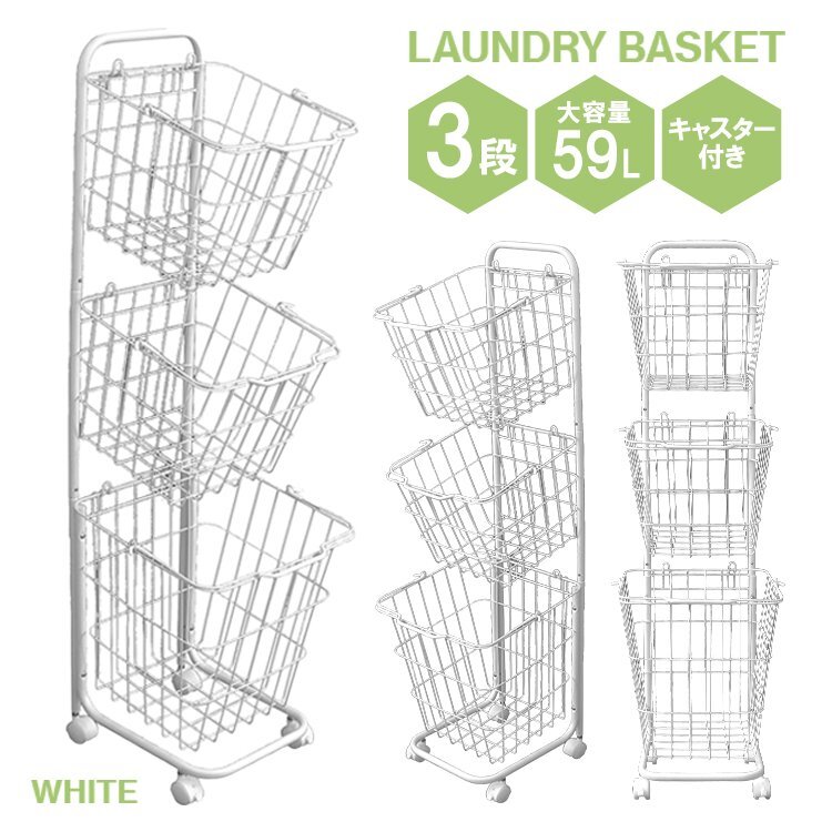 ランドリースペースを無駄なく使える縦置き3段タイプ! 通常のバスケットを分別用に3つ並べて置くと幅を取り、上部にデッドスペースが生まれてしまいます。 こちらの商品は幅約37cmのバスケットを3つ縦に並べることが可能。 デッドスペースを活用することで物が多くなりがちな洗濯機まわりも無駄なくすっきり。 狭くなりがちなスペースを有効に活用することができます。 バスケットの容量は小2つが各15L、大が23L、合わせて53Lの大容量となっております。 3つのバスケットは取り外しも可能で、持ち手があるのでベランダに運ぶ時なども便利にお使いいただけます。 キャスター付きで、ラックごとの移動もスムーズです。 ランドリー以外にキッチンの食品ストッカー、リビングの雑貨入れ、おもちゃ収納も使えます! 【商品仕様】 カラー:ホワイト サイズ: スクエア型:(約)幅37.5×奥行き37.5×高さ123cm バスケット内寸 小:(約)幅30×奥行き30×高さ25cm 大:(約)幅33×奥行き33×高さ36cm 重量:(約)3.6kg 容量 スクエア型:(約)59L(小16L×2、大27L) バスケット耐荷重:(約)15kg 素材:スチール(粉体塗装)、ナイロン、他 ランドリーバスケット 2段 3段 1段 大容量 ワイヤーバスケット ランドリーラック 洗濯物入れ かご 洗濯かご 洗濯物 脱衣かご ランドリー収納 ランドリーボックス 洋服 衣服 収納 おもちゃ収納 雑貨入れ おしゃれ シンプル 北欧 西海岸 人気 おすすめ WEIMALL |