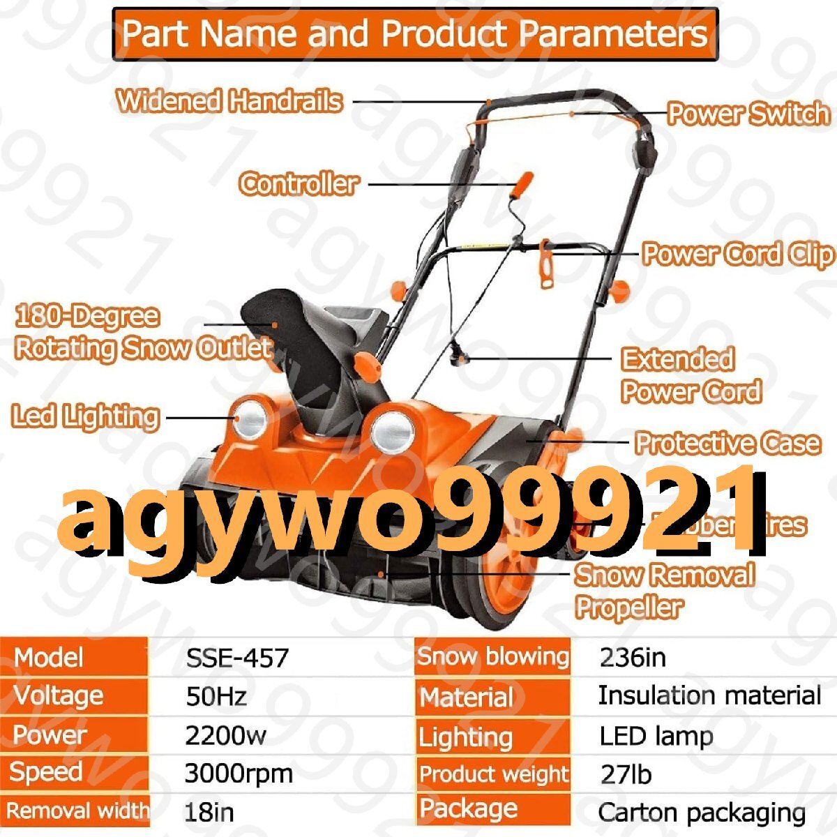 名前: 電動除雪機 素材:ナイロン、ABS モーター: 銅太線ターンモーター 電源: 98フィート電源コード 電圧: 220V 組み立てが必要: はい 掃引幅: 45 cm/18 インチ 掃除の深さ: 80 cm/8.01 インチ 最大射程(投雪高さ):6m 総重量:13kg