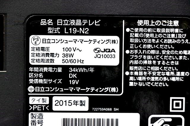 日立 HITACHI 19V型液晶テレビ Wooo L19-N2 / リモコン&HDMIケーブル付 60475Y