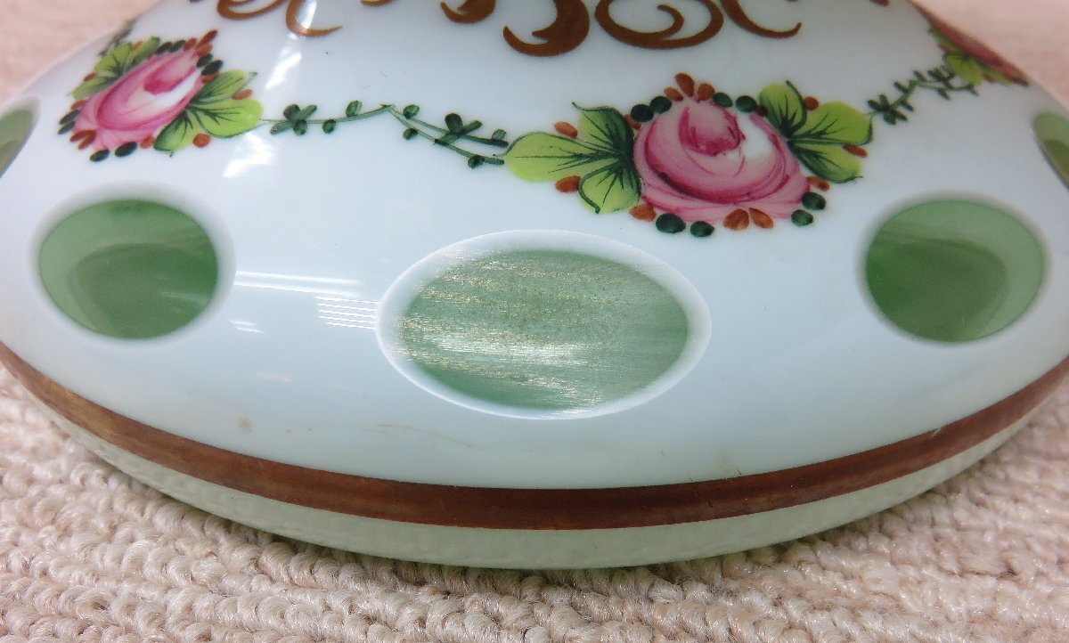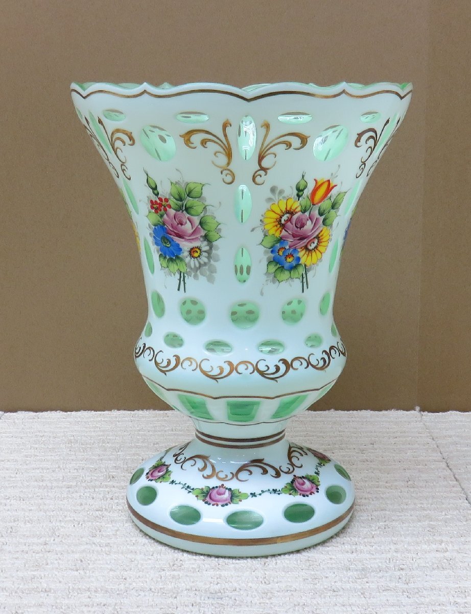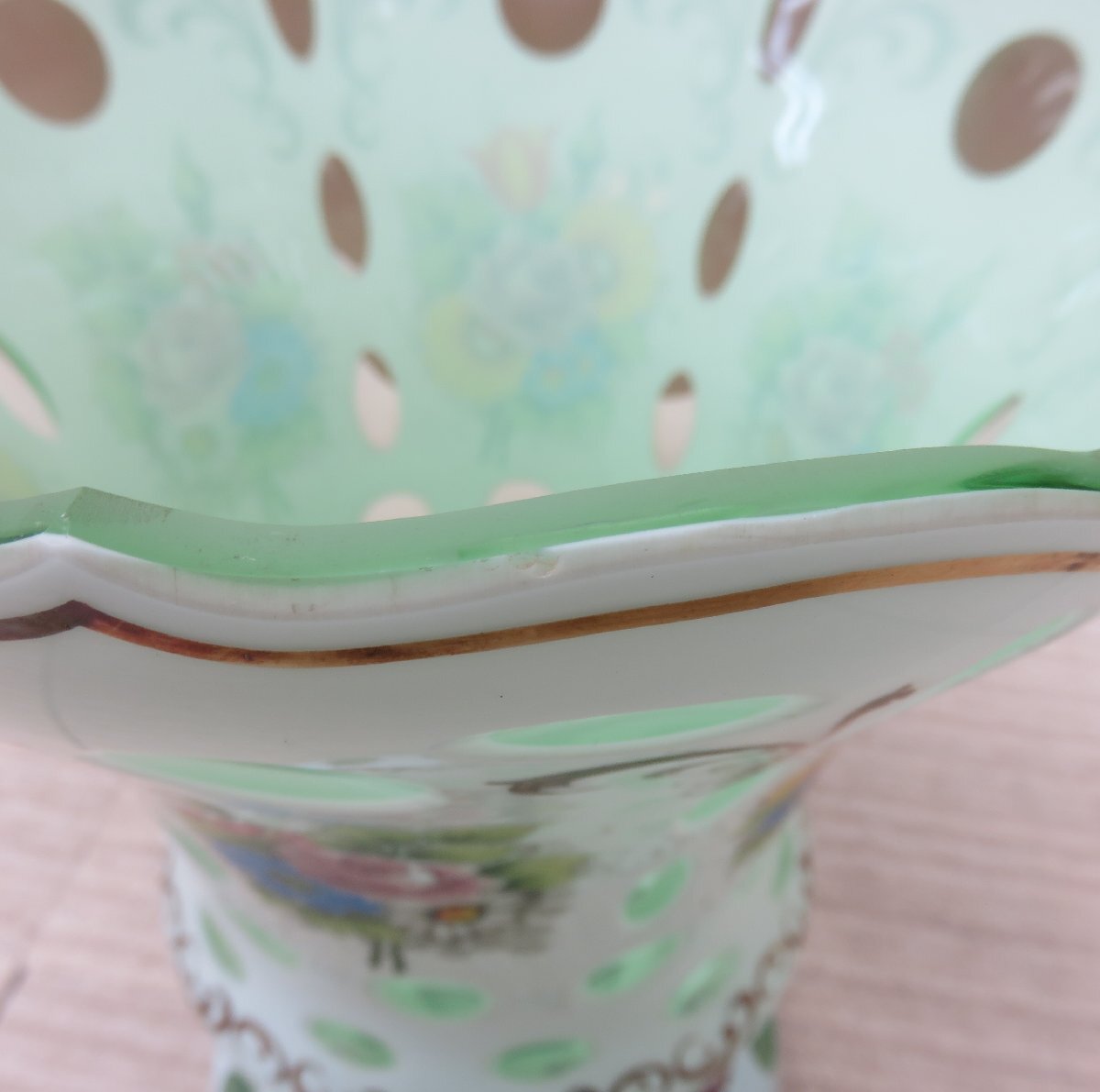 中古 フレア型 花瓶 ガラス 乳白色 グリーン 花柄 金彩 フラワーベース 花器