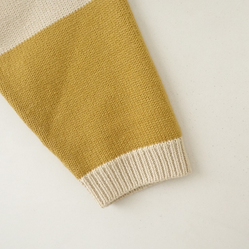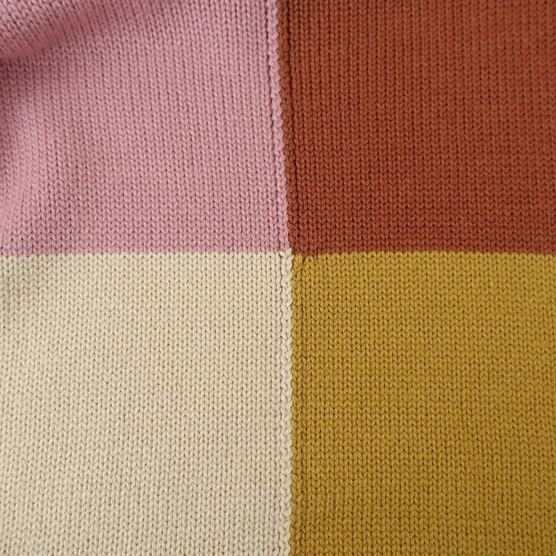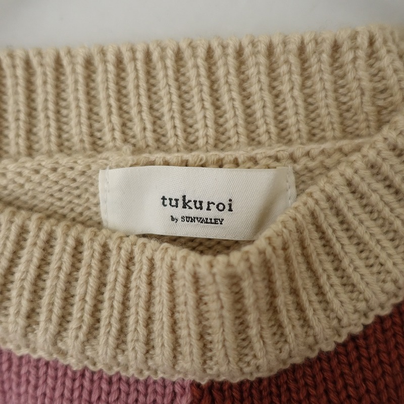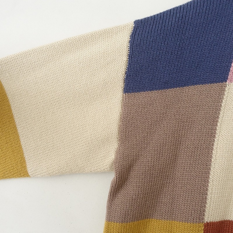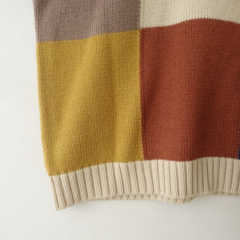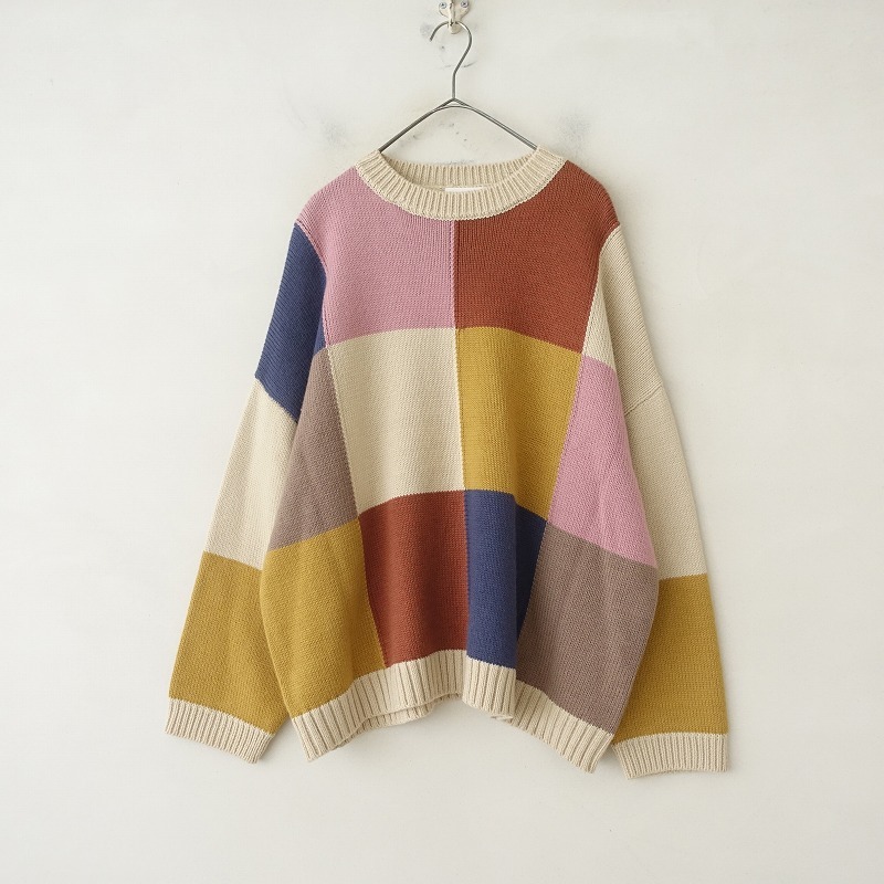 | tukuroi by SUNVALLEYのブロックチェックニットプルオーバーです。ベースのカラーはベージュで、前身頃&袖にはブラウン・マスタード・ネイビー・ピンクなどの切り替えが施されております。粗目のニット地で、プルオーバータイプで着脱でき、ネック・袖口・裾はリブ編みです。 |