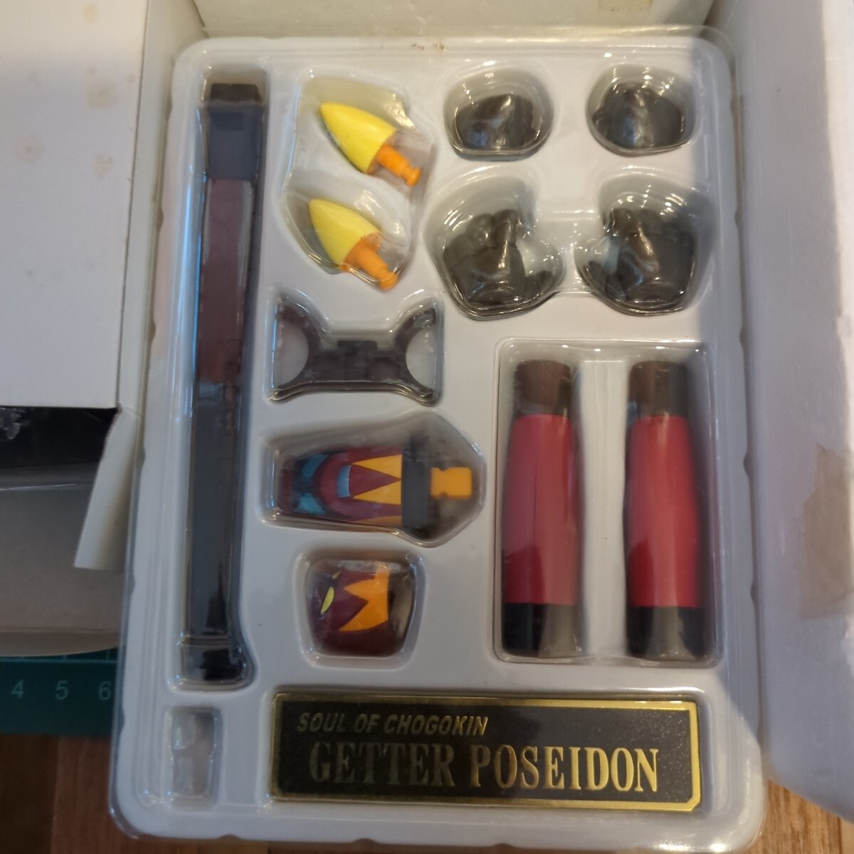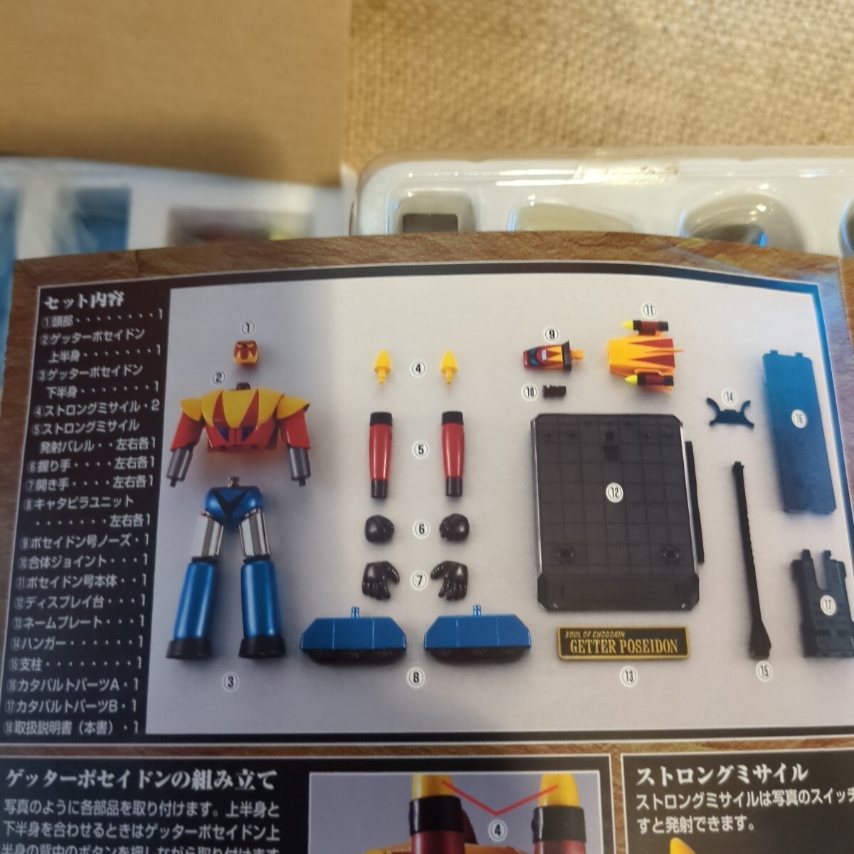 アニメ『ゲッターロボG』に登場するロボット「ゲッターポセイドン」です。背中のストロングミサイルの発射ギミックや、胸部のハッチが開閉し手動でスクリューが回る「ゲッターサイクロン」の再現など、様々なギミックが搭載されています。