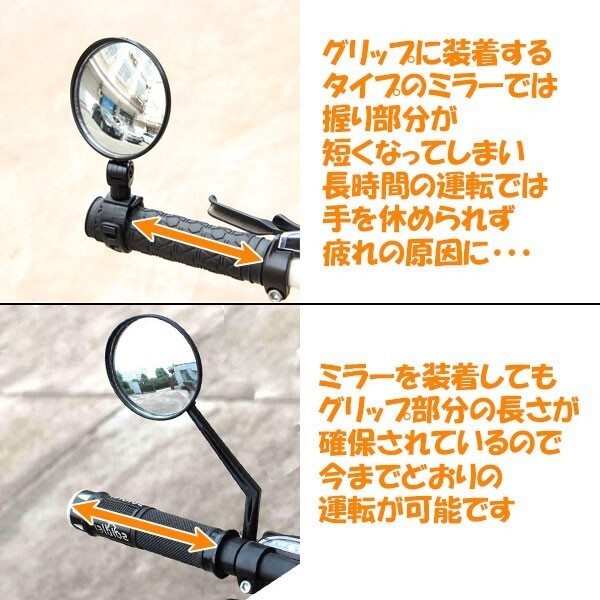 | 商品説明 | 自転車用のサイドミラーです 凸面鏡になっており広角ワイドビューで後方確認ができます ハンドルバーの径22.2mm用で ほとんどの自転車に取付できるミラーです ママチャリ シティサイクル クロスバイク マウンテンバイクなど幅広く使用可能です ※ドロップハンドル車など特殊車両は不可 軽量硬質プラスチック素材のバックミラーなので 車重に影響を与えにくいです |
