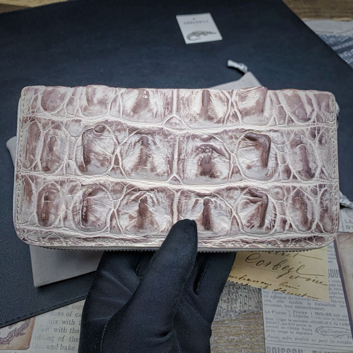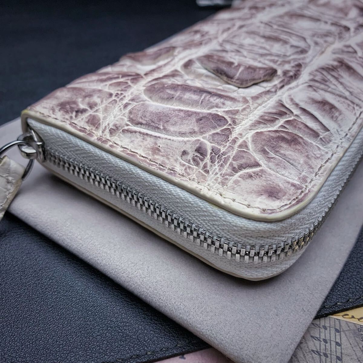 ・クロコダイルと呼ばれている品種のワニ革は人気が高く、独特の模様と凹凸が魅力で、高級ブランド品を中心にクロコダイルが多く使われています。今回はワニ革の代表格である『シャムクロコダイル』のセンターカット背中革のラウンドファスナー財布を出品します。