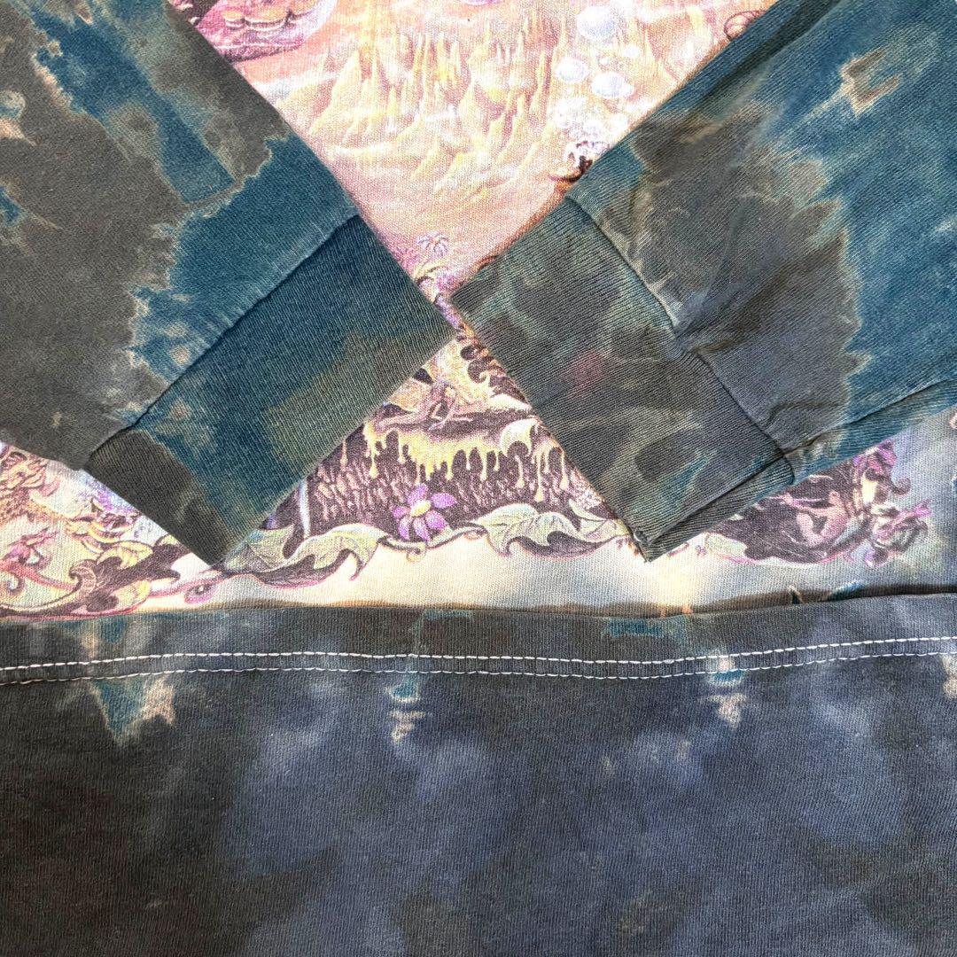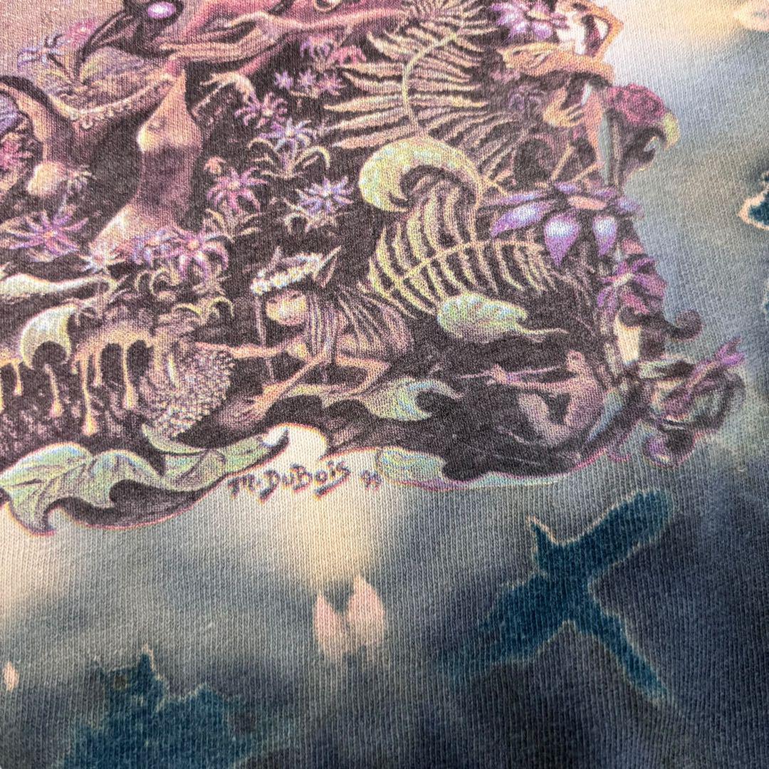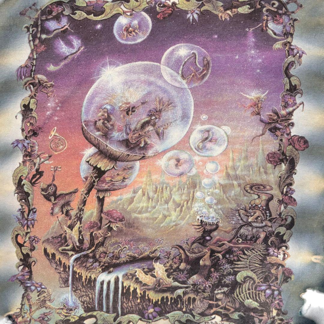 Grateful Dead(グレイトフルデッド)をはじめとする音楽アートで知られるアーティストMike Dubois(マイク・デュボア)による、1995年サイン入りグラフィックがプリントされた希少なヴィンテージ・ロングスリーブTシャツ。幻想的なフェアリーや動植物、バブルの中に広がる異世界が描かれたアートは、彼の代表的スタイルのひとつ。タイダイ×両面プリント×USA製JENSENボディという、90年代ならではの魅力が詰まった一点です。