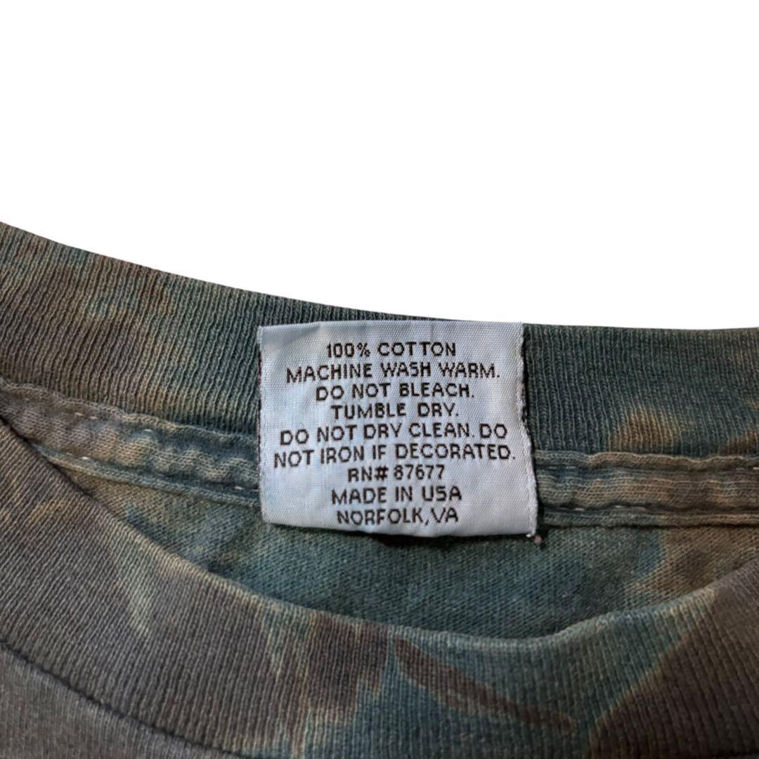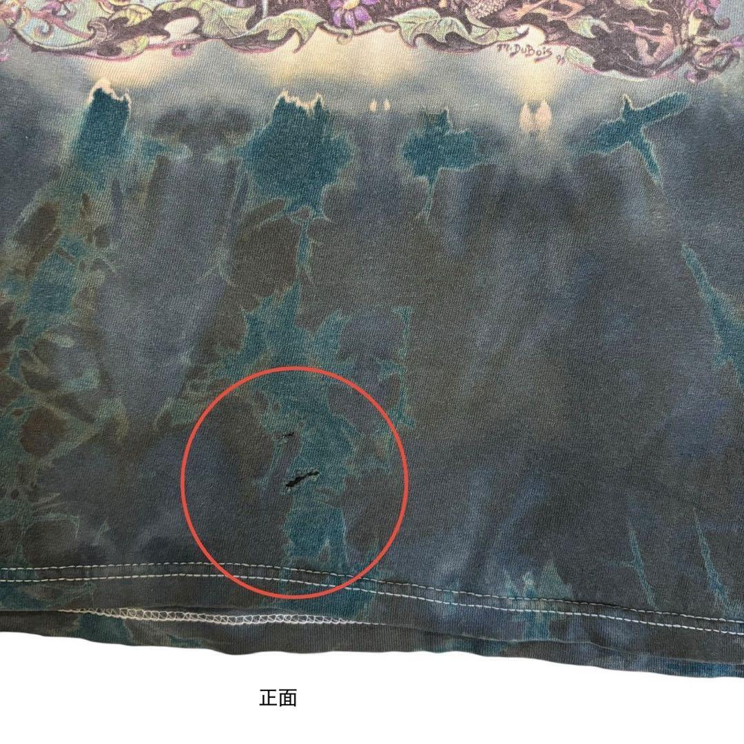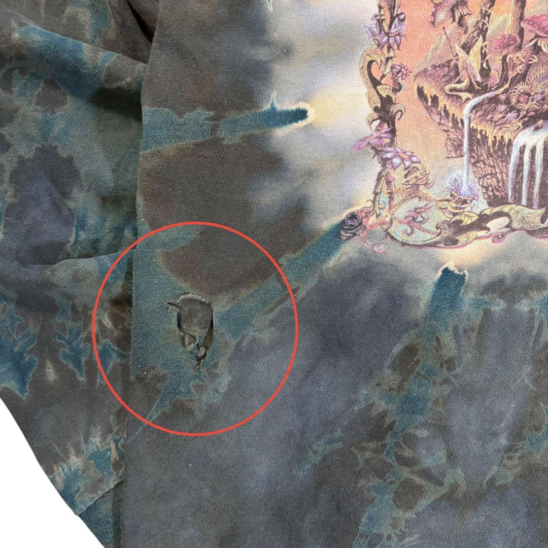 ヴィンテージらしい使用感があり、前身頃下部・脇下・肩口などに数カ所ダメージや穴があります(写真参照)。アートとタイダイの風合いにより味として楽しめるレベルです。プリントの発色は良好です。