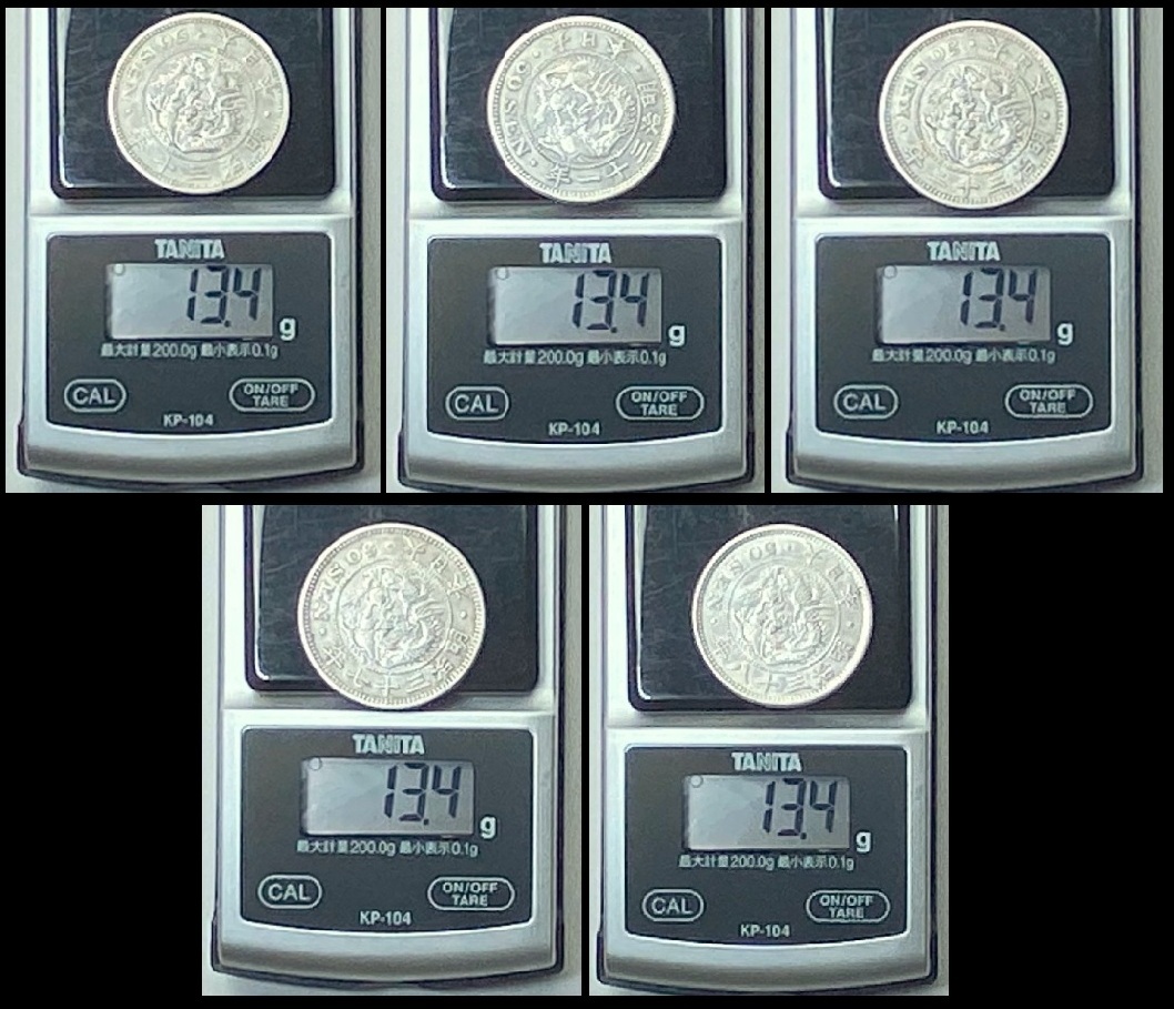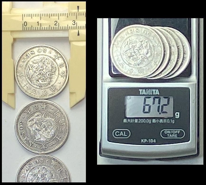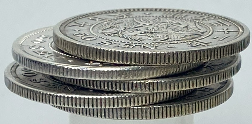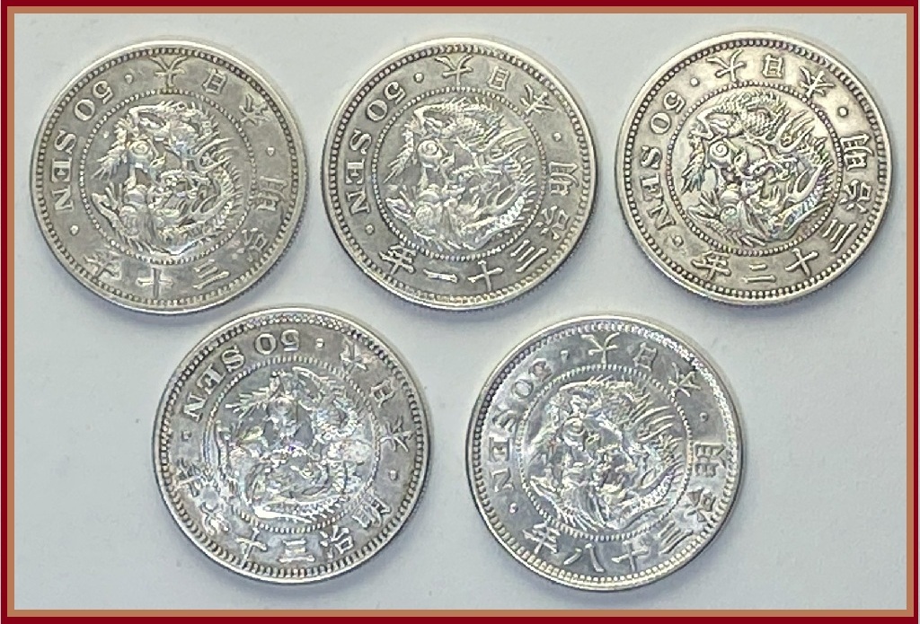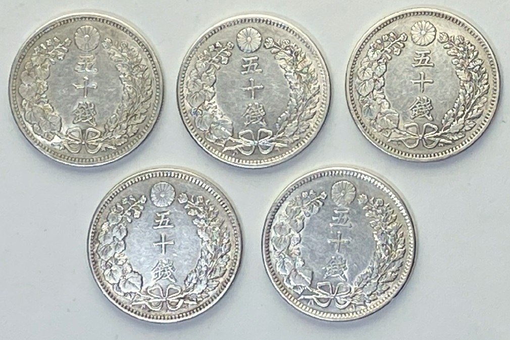 【 竜50銭銀貨 】 明治30・31・32・37・38年 各1枚=合計5枚