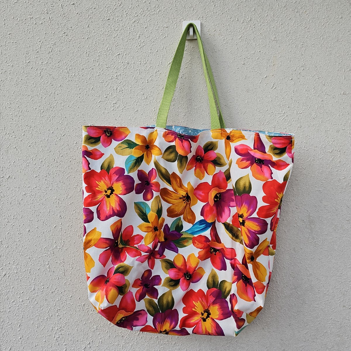 サイズは、高さ40cm、横 上部54cm、底部38cm、マチ15cm、ヒモ50cmです。