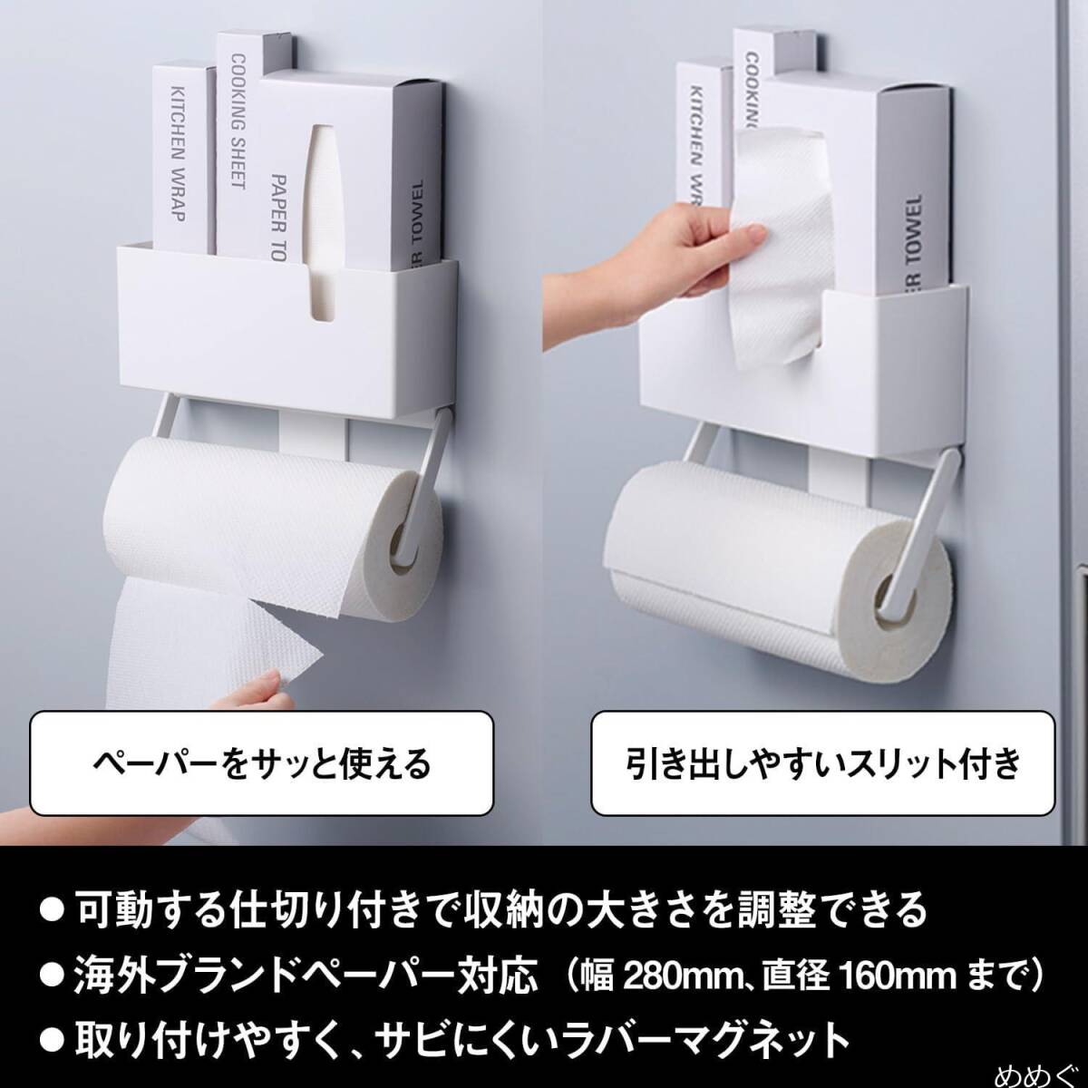 ラップやペーパー類をまとめて収納できる便利なラック、サビにくく傷つけにくいラバーマグネットです。