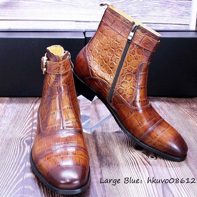 最高級■新品 ショートブーツ マーティンブーツ 牛革 ワークブーツ 鰐柄 エンジニアブーツ 職人手作り 本革 レザーブーツ ブラウン 27.5cm