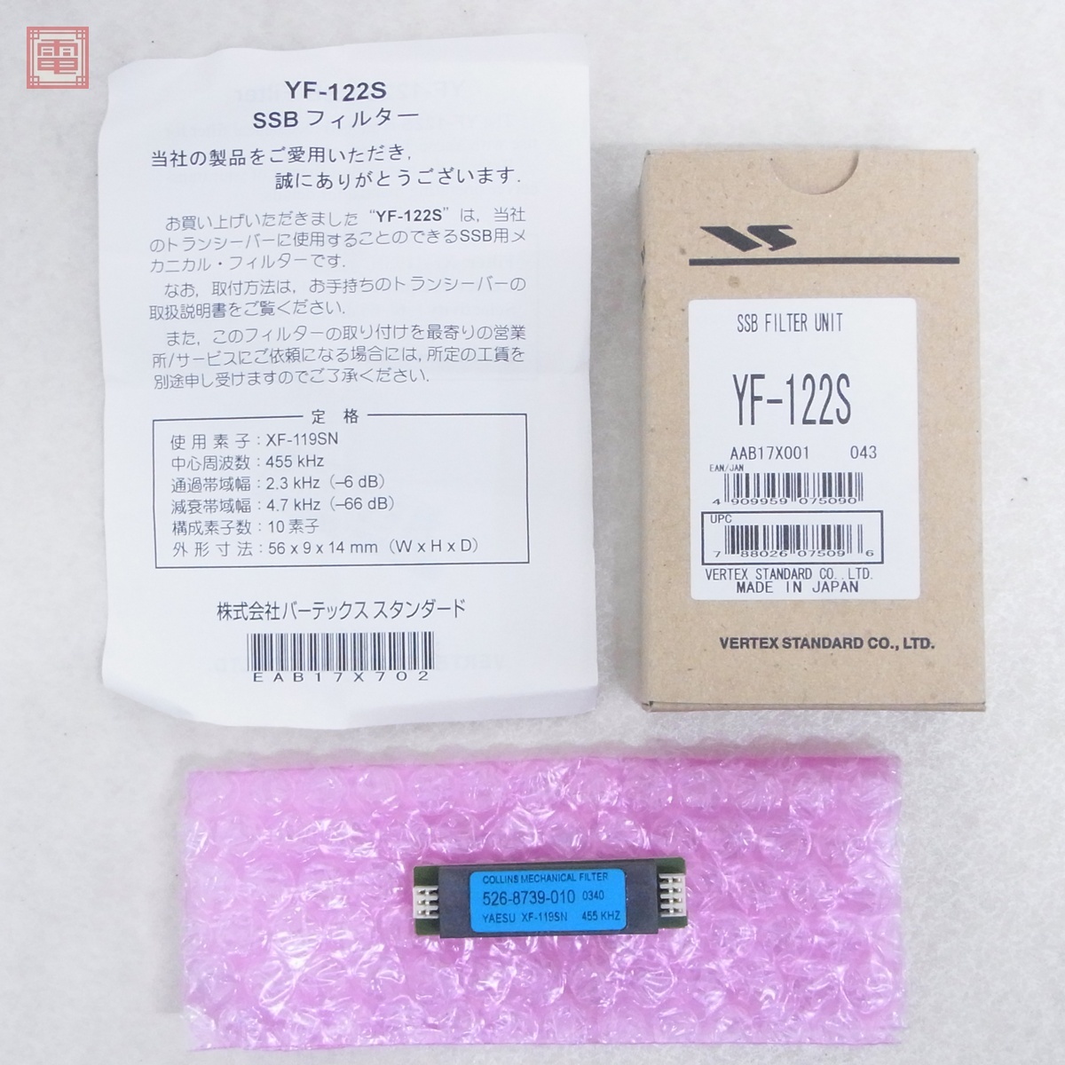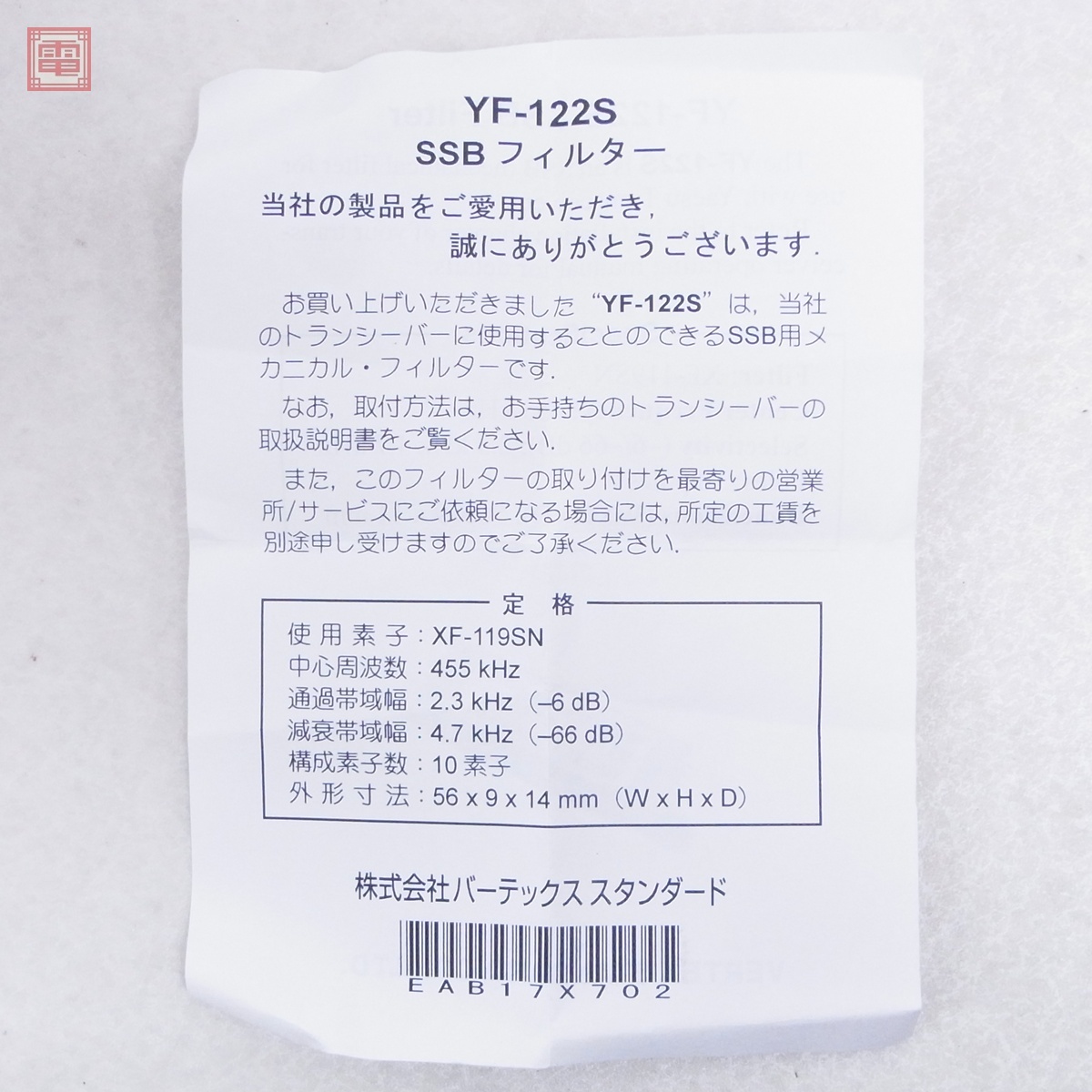 ヤエス YF-122S XF-119SN ヤエス製無線機用 SSBフィルター 取説・元箱付 八重洲 ■<出品物> ・出品物は全て撮影しました。付属の有無や過不足は写真からご判断ください。 ■<状態> ・中古品です。 ・目立つ傷等は無く、比較的キレイな状態です。 ・タバコ臭はありません。 ■写真のものが全てです。付属物の有無や状態については写真からご判断ください。 ■付属物については細かいチェックはしておりませんので、万が一、欠品があったり余計な物が入っていたとしてもご了承ください。 ■商品到着後、当店の保証期間中は、商品及び箱や取説、付属品などを1つでも廃棄や破損をしないようにお願い致します。廃棄や破損をした場合、商品に問題があった場合でも対応や返金などの対処ができなくなります。 ■商品によりますが、発売されてから10年以上経過している中古品である事をご理解頂いた上でご入札をお願い致します。なお、新品や美品、また特記事項がある場合は別途明記します。 | |||