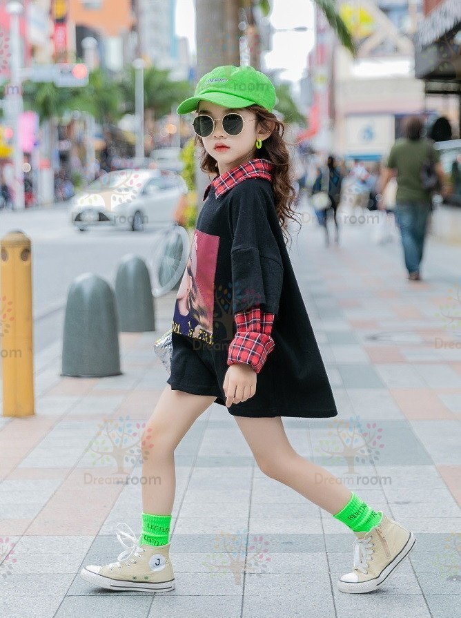 kids タータンチェック シャツ重ね着風 トップス 【110cm】ブラック 女の子 ロンT 学生 秋服 長袖 K-418bk