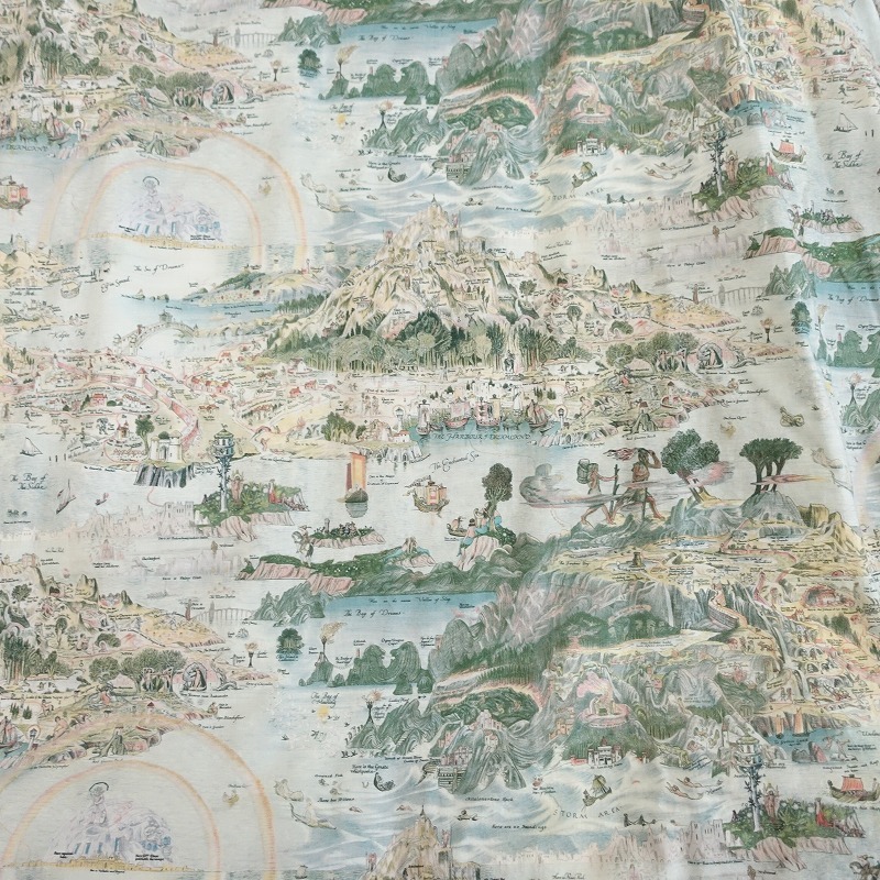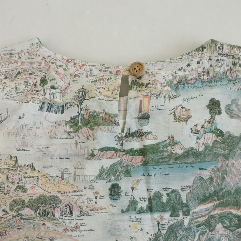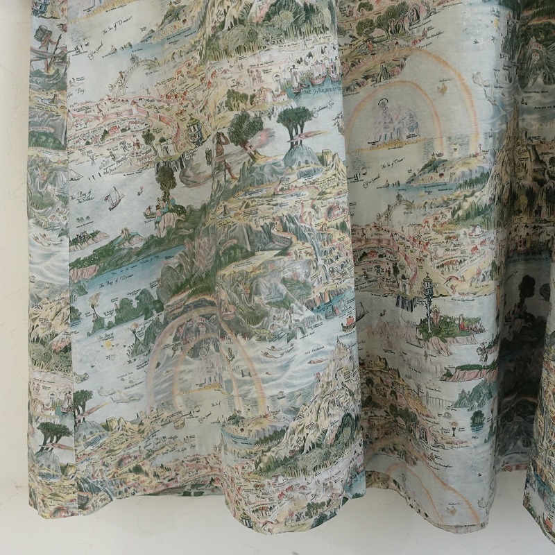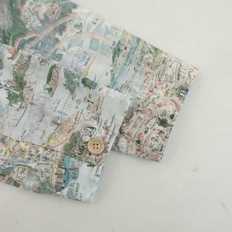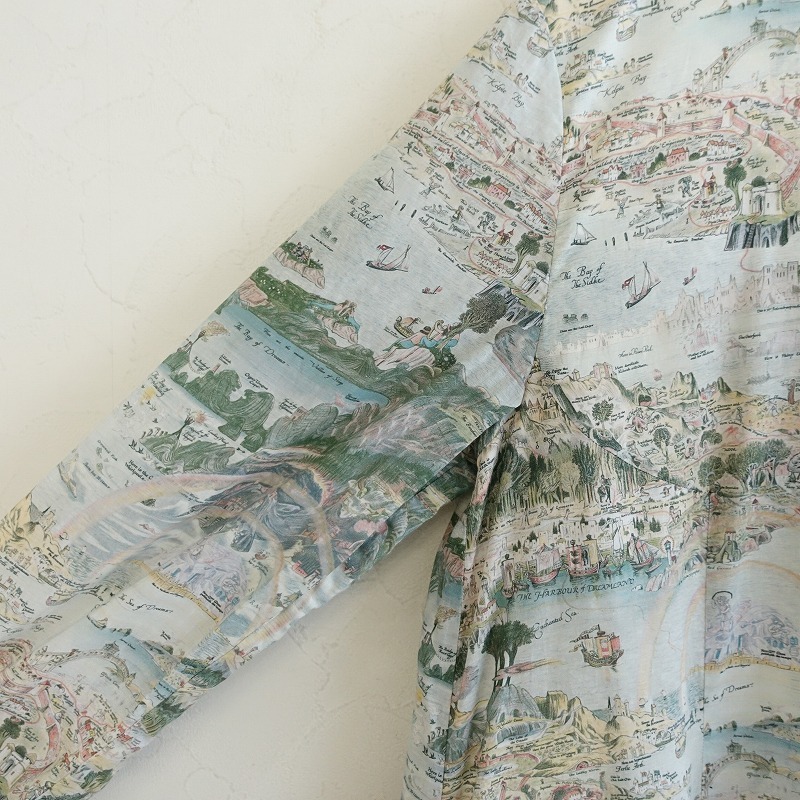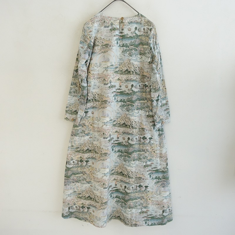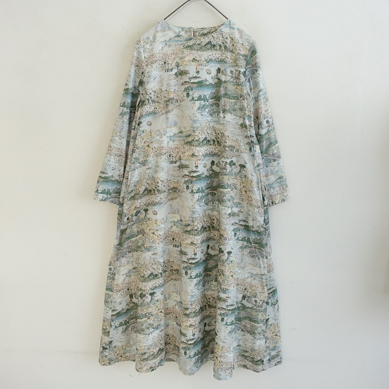 YAECA WRITEの91706 STORY ISLAND Aラインドレスです。カラーはグリーン系の総柄プリント(ブランド表記カラーはSTORY ISLAND)で、布帛地です。後ろネックにループボタン&ドロップホール付きのプルオーバータイプで着脱でき、袖口はボタン留めです。腰両サイドにシームポケットがあり、袖以外に生成り色の綿裏地付きです。定価(メーカー希望小売価格)44,000円の商品です。 |