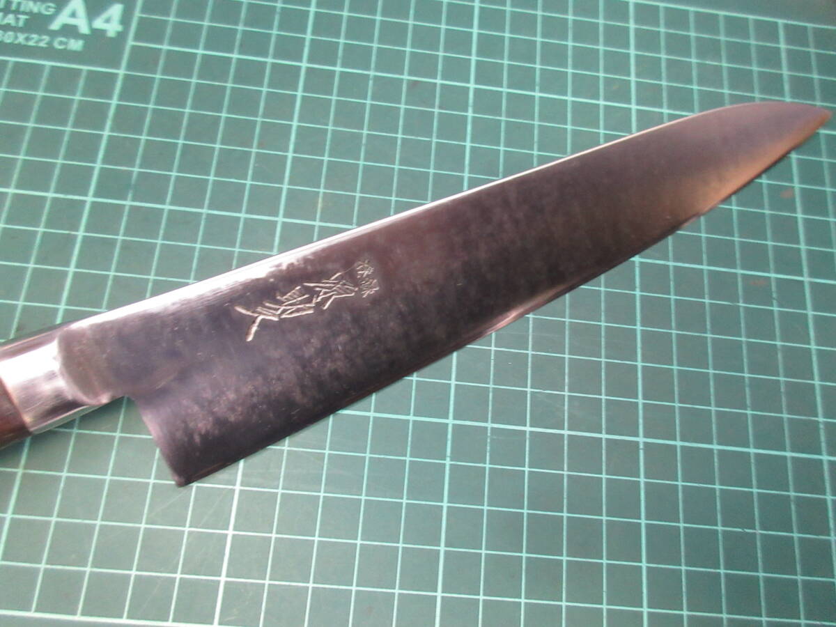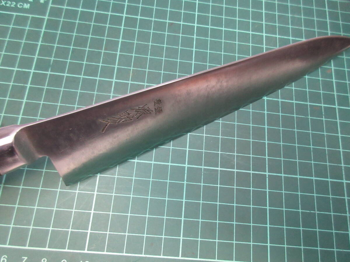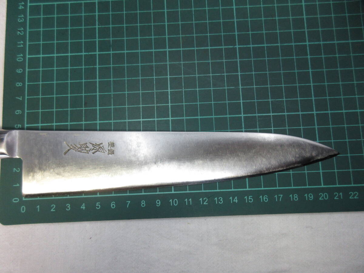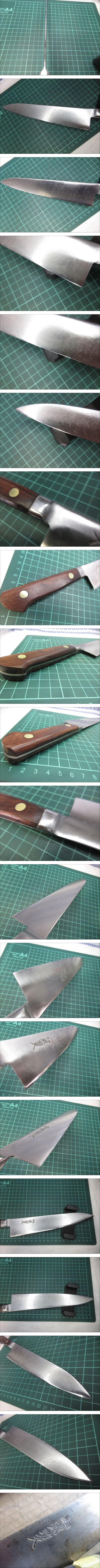 「受取連絡」が出来ない方の入札はお断りします。 こちらから評価を入れることはありません。 ■■■■■■■■■■■■■■■■■■■■■■■■■■■■■■■■■ 牛刀21cm 全鋼で直ぐ錆びます。 最後の写真は磨き前です。 歪みや反り、落としきれない錆があります。全体的に使用感があります。 包丁のみの出品です、付属品はありません。 ■■■■■■■■■■■■■■■■■■■■■■■■■■■■■■■■■ 発送はレターパックです。(補償はありませんのでご注意ください。) 送料を抑えたい方はライト(430円)を選択してください。(ただし厚さ制限のため簡易包装です、新聞紙で包む程度ですので輸送時の衝撃で包丁の歪みや破損のリスクがありますのでご理解ください。) プラス(600円)は衝撃対策で厚めの梱包をします。(複数同梱の場合は包装が簡易になります。) 刃渡り21cmまではレターパックで発送できると思いますが長い刃は着払いゆうパックになります。 小振りな包丁なら3本くらいまでライトで同梱できます。プラスなら5本までは入ると思いますが21cm以上の包丁が絡むと本数が限られます。 以下は定型文です。 洋包丁は両刃、和包丁は片刃を前提に出品しています。 (タイトルと個別情報に刃付けの記載が無ければ上記のとおりです) 他の出品物と同梱できます。(システム上、着払いとのまとめ依頼ができません。落札後に同梱希望のメッセージを 頂ければ対応します。) 送料と材質についての質問には返答しません。 包丁につきましては全てジャンクとし、ノークレームノーリターンでお願いします。 出品からお品物が届くまでに時間が掛かった場合、鋼などの材質ですと変色や錆などの変質がある場合がございますのでご了承ください。 錆の酷い包丁は再生研磨していますが、あくまで素人仕事です。電動工具を用いての仕上げです。 削る、磨くは出来ますが歪みの修正は出来ません。中古品ですので歪みがある前提で入札してください。 磨きにより錆に強くなるメリットがありますが切った食材が張り付くデメリットがあります。 切れ味が悪いや、思ったより汚いなどのクレームはご遠慮ください。 触れば怪我をするほどの最低限の刃付けはしてあります、開封時にご注意ください。 肉眼での検品ですので微細な傷や欠けを見落としている可能性もありますので写真を参照してください。 現状維持のために防錆に椿油を塗布していることがありますので写真に不自然な艶が写っている時があります、ご了承ください。 (鋼の洋包丁の場合は中子にも塗布するために柄にも油が散布しています。ご使用前に洗浄してください。) 中子やリベットの錆を落とす為に柄ごと研磨する場合がありますので、柄に研磨痕が残っている時があります。 柄の仕上げに軽く蝋引きしています。 片刃の場合、研ぎですが砥石傷が付くのを嫌ってベタ研ぎはせず、峰をわずかに浮かして仕上げています。(綺麗な裏押しの和包丁はベタ研ぎです) 10対0ではなく9対1位の感覚です、完璧な片刃をお求めの方は入札をご遠慮ください。 (和包丁は片刃前提です、洋包丁が片刃の場合にはタイトルと個別情報に片刃と記載してあります) 有効利用、再生利用できる方の入札をおまちしています。 写真で判断いただき、商品説明を理解出来る方のみ入札をお願いします。 クリーニングなどはせず、写真のままお送りします。 専門知識が乏しい為、質問に答えられない時があります。 ブランド品の真偽については不明とさせて頂きます。 素人による中古出品です、すり替え防止の為にもノークレームノーリターンでお願いします。 入金を確認しました時点でお取り置き終了と判断し発送準備にはいります。 同梱発送、お取り置きを希望の方は入金前に連絡頂くと助かります。 落札後、48時間以内の初回連絡、五日以内の入金が確認出来ません場合は落札者様都合のキャンセルとさせて頂きます。 その場合落札者様に非常に悪い評価とブラックリストへの登録を同時に行いますのでご了承ください。 (以後こちらのオークションに入札が出来なくなります) #お取引に不安を感じる評価の方は削除させて頂く事があります。 #総合評価が高くても直近に悪い評価がある方も削除致します。 #いたずら入札を防ぐ為、1万円以上の入札額時の場合は新規の方の入札をお断りします。 #(どうしても入札したい時は質問欄より入札意思をお伝えください。) *評価を入れて頂くと反射的にお返しする形を取っています、不要の方は評価を入れないで下さい。 *こちらから評価をお付けすることはありません、不要の方は「受取連絡」で終了して下さい。 自己紹介欄もあわせてお読みください。 | ||