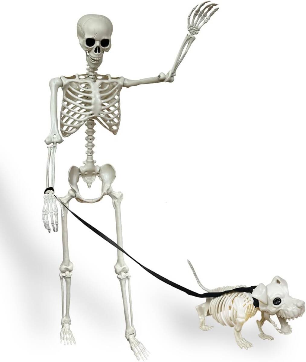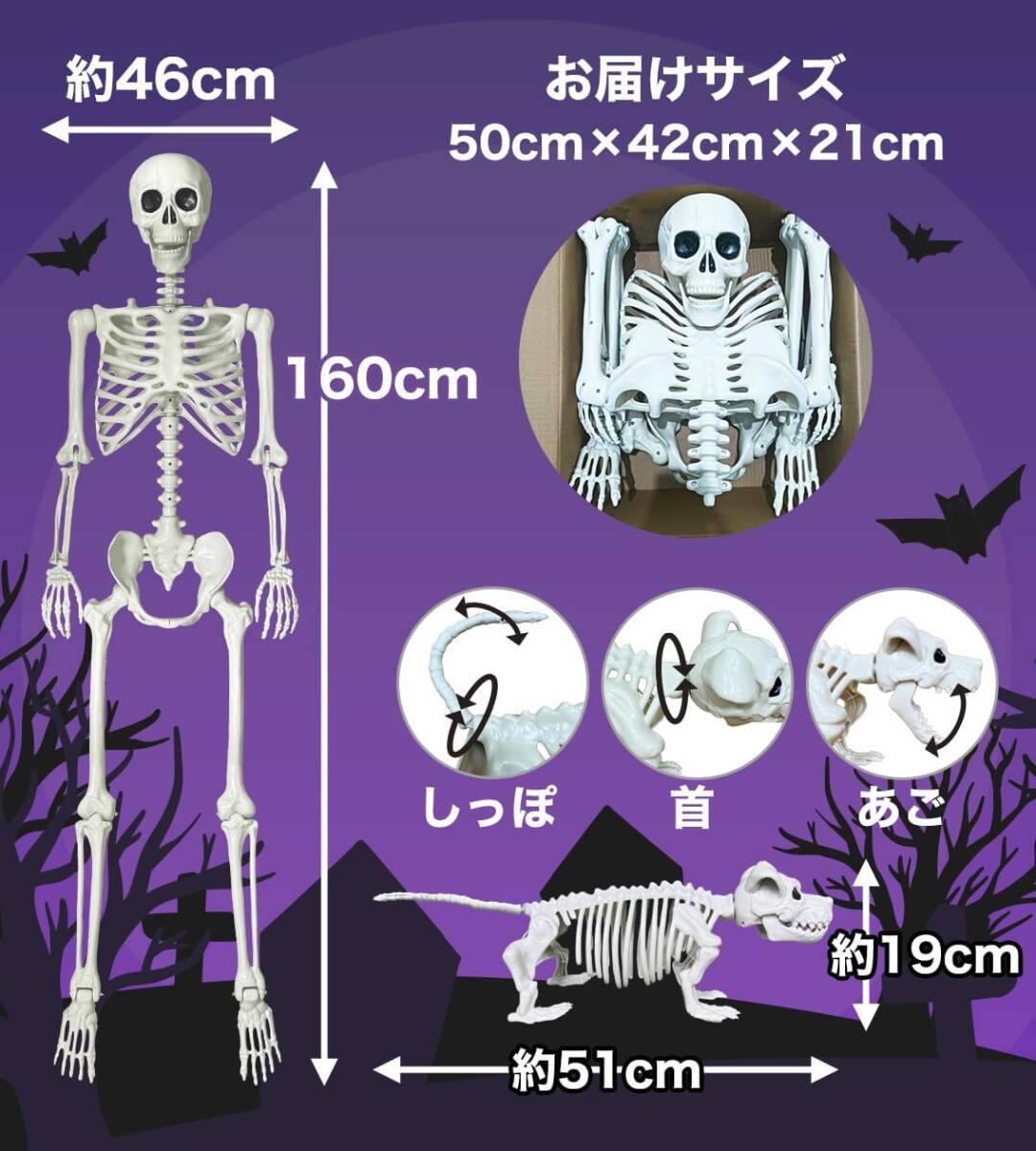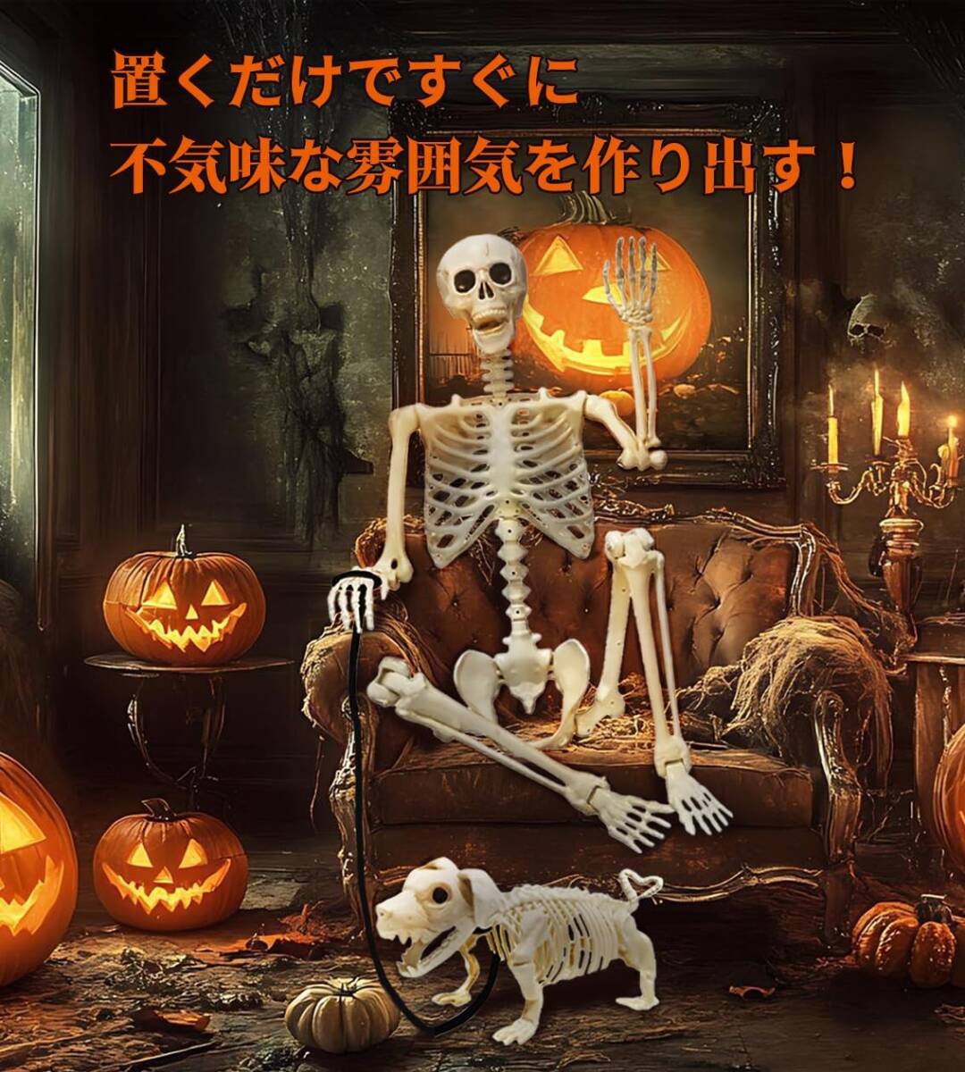大きい!人間サイズでビックリ ハロウィン 骸骨 160cm 飾り 犬の骸骨 付き セット 動く 置物 プラクチック製 軽量 がいこつ 人形