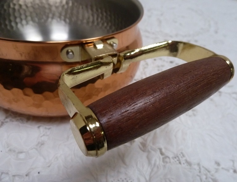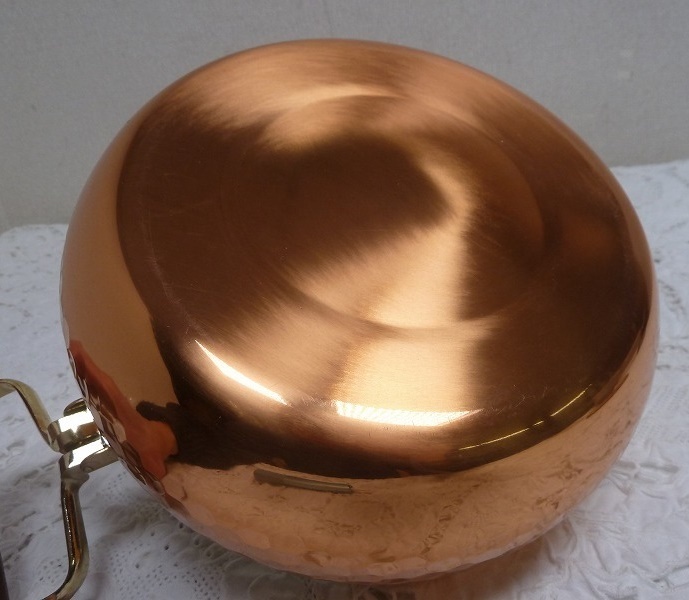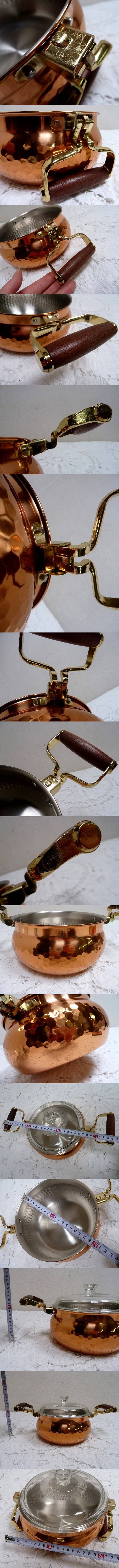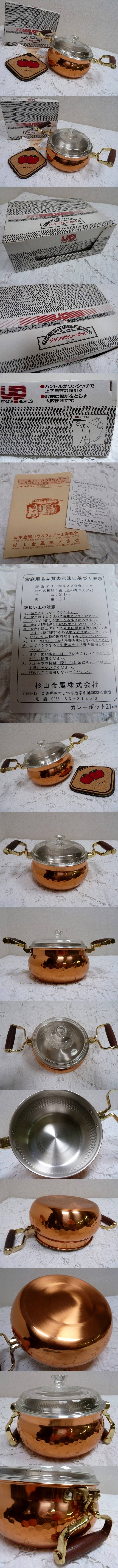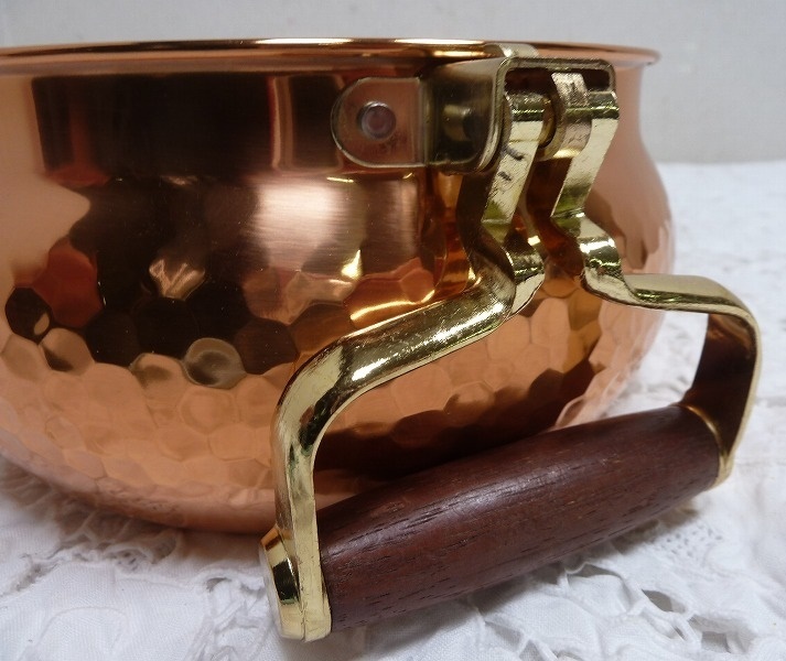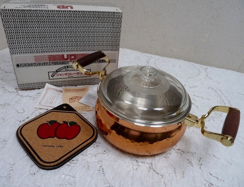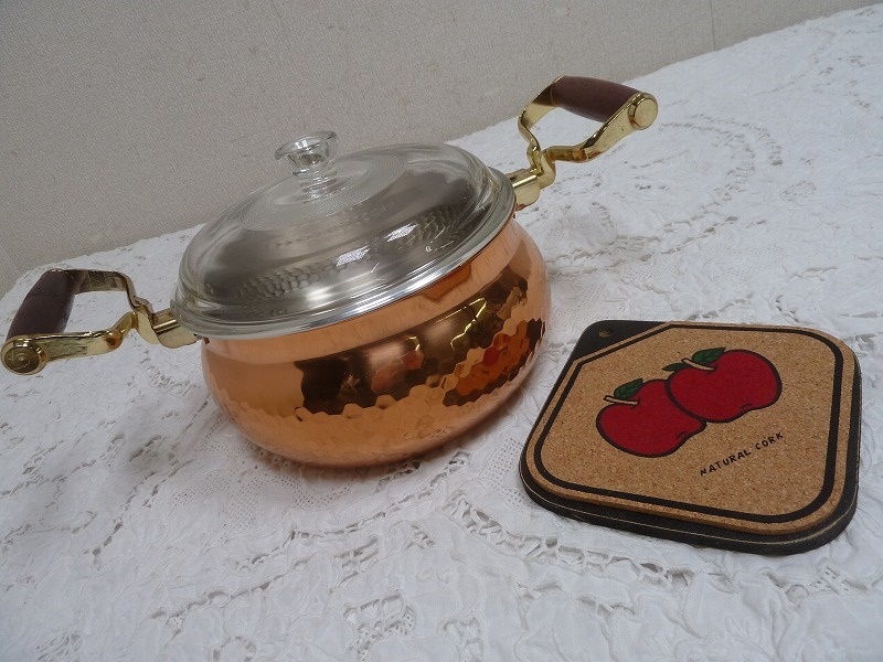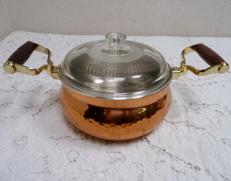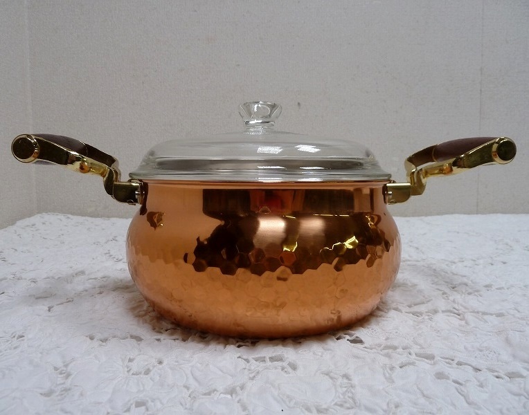 (☆BM)銅製(0228-②)ジャンボカレーポット 21㎝/3L コッパー 鍋敷付き 両手鍋 シチュー レトロ 調理器具 ガラス蓋付き