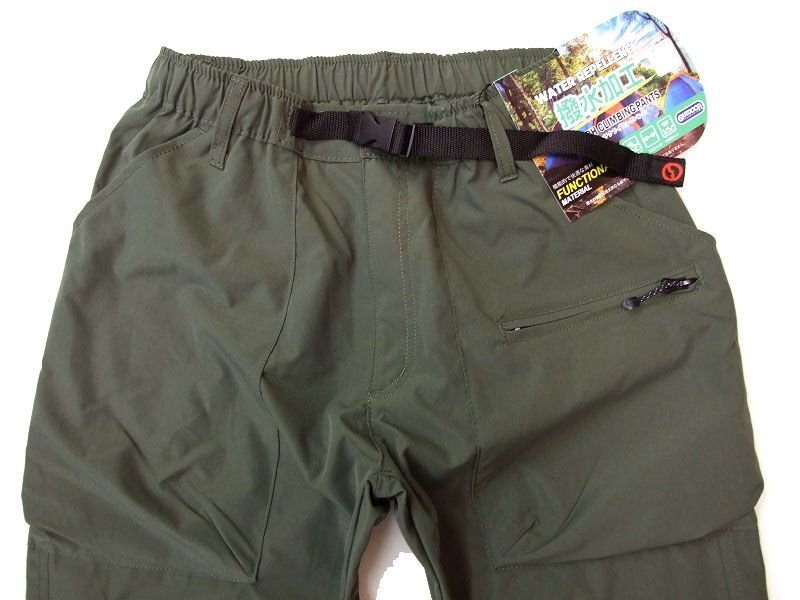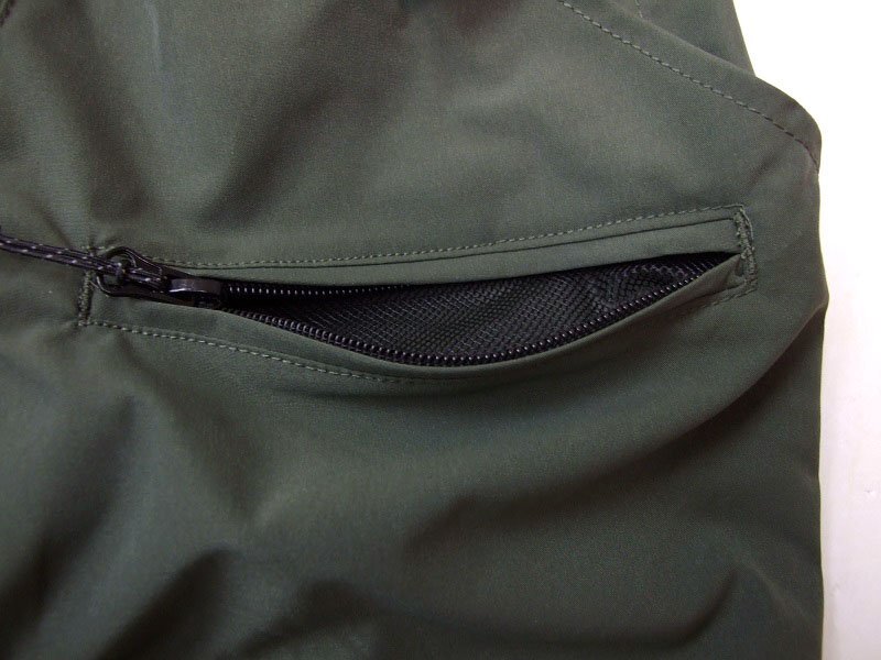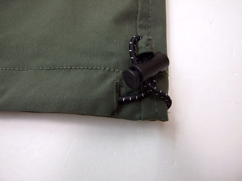 UVカット、ポリストレッチ撥水、ジップポケット、クライミングバックル 、裾ストッパー