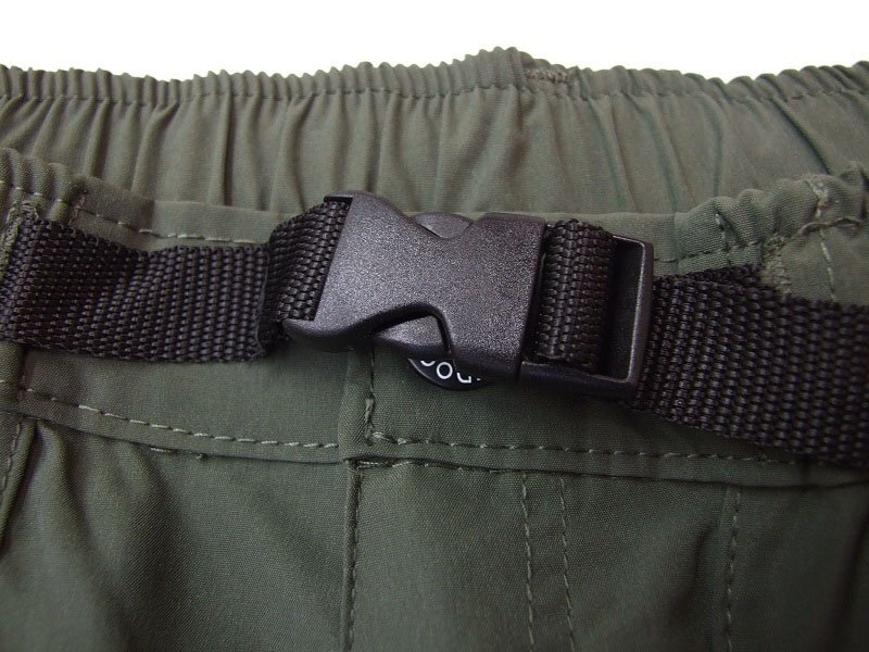 フロント開閉はジップ式。ウエストはサイズ調節可能なウェビングベルト、ゴムで伸縮する機能性に長けたディテール。