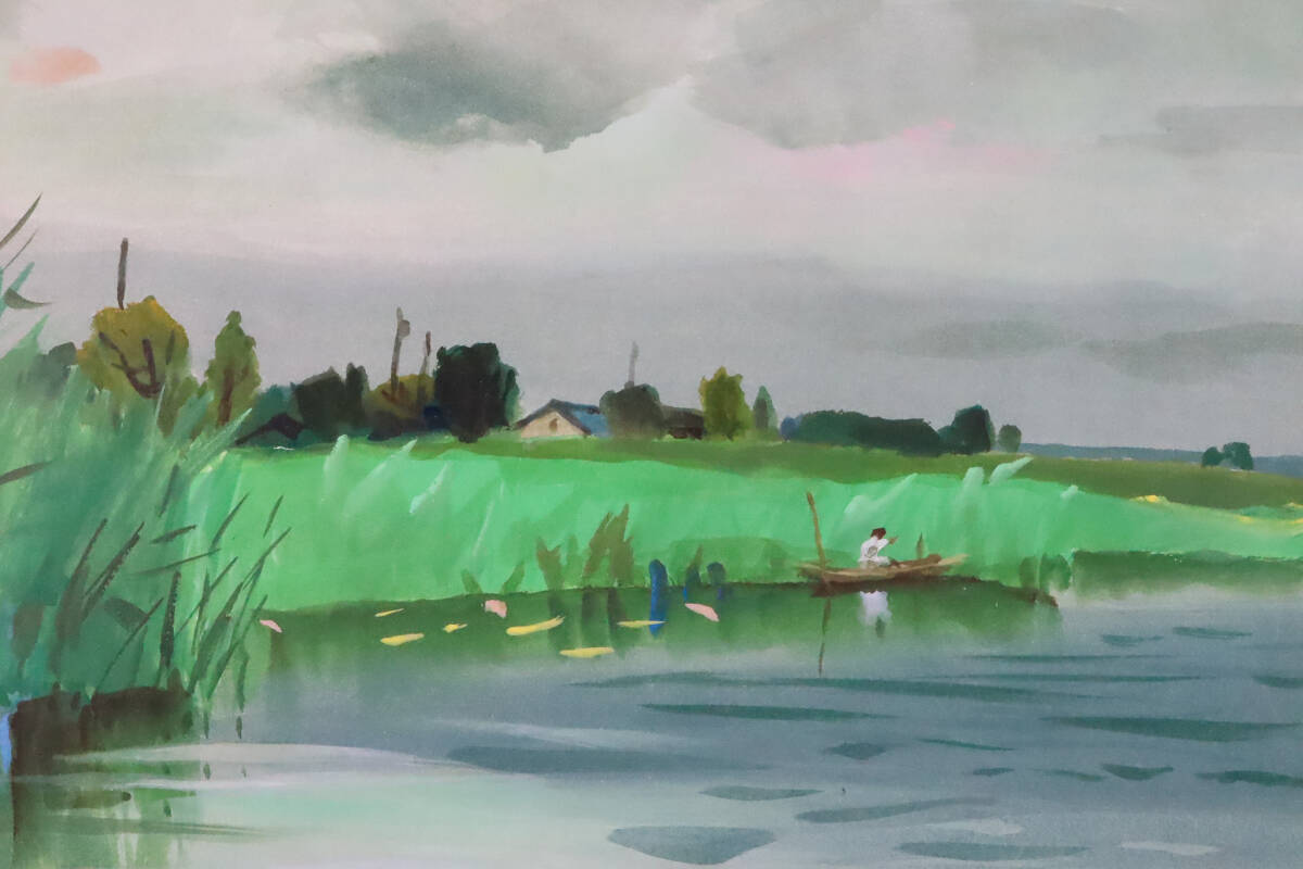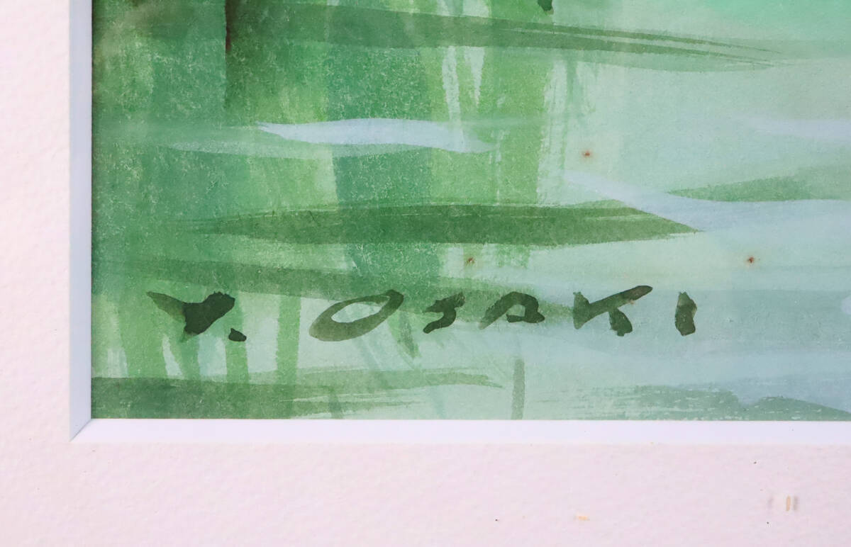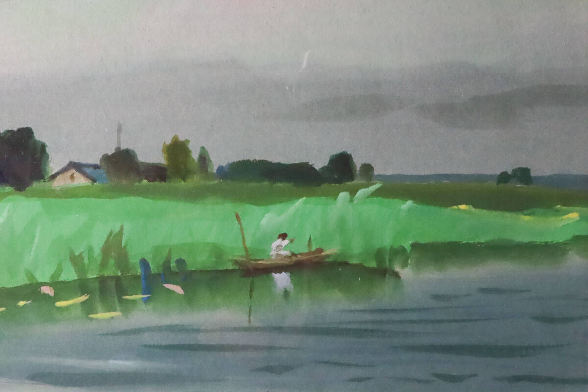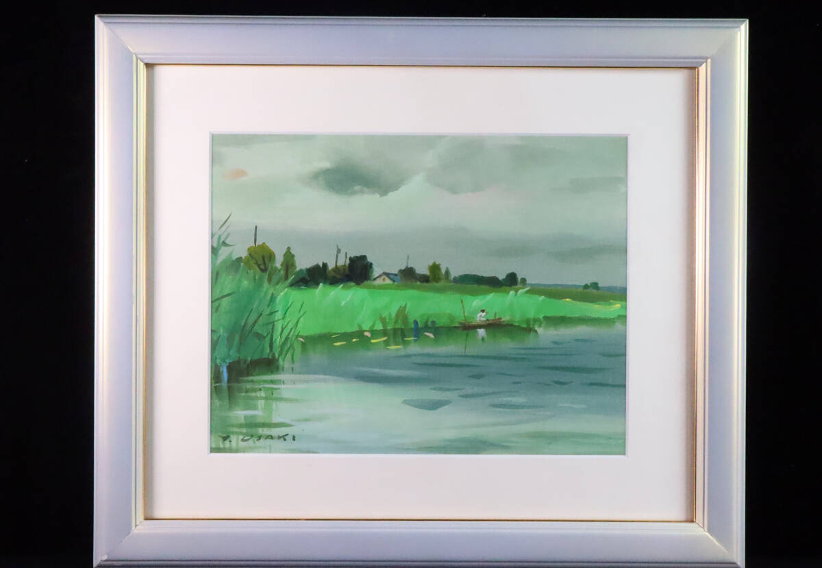 ◇雅◇ 真作保証 大崎善生 水郷 水彩 肉筆 風景画 4号大 絵画 額装 水辺風景 水彩画家 箱付 千葉県 香取市出身 /TKB.25.9 [A150.3] PN4