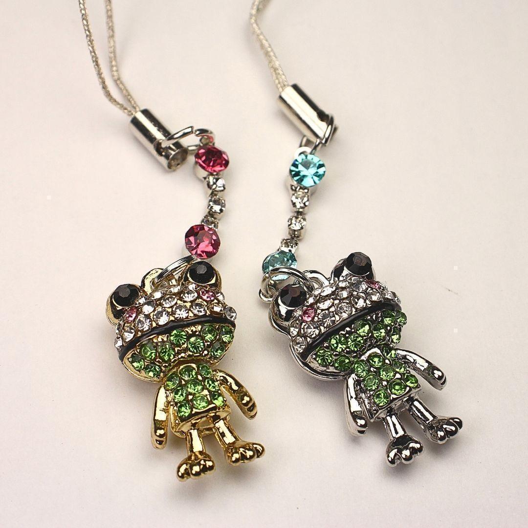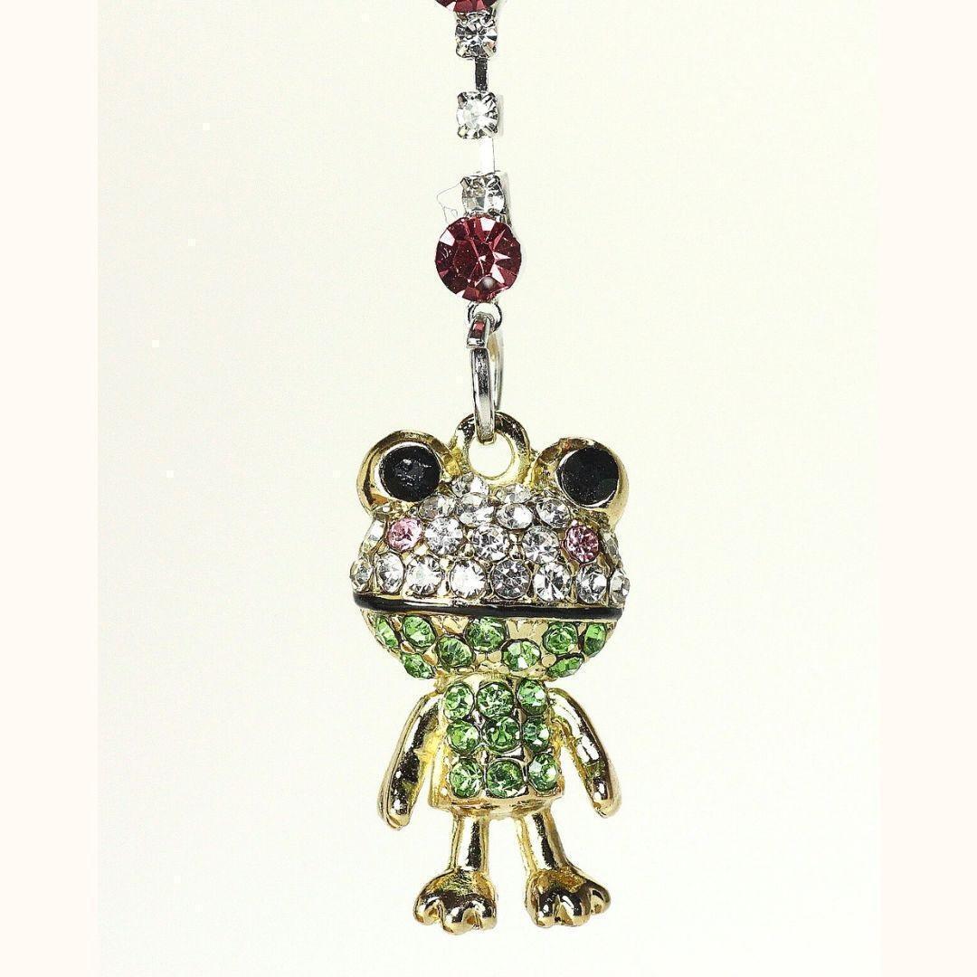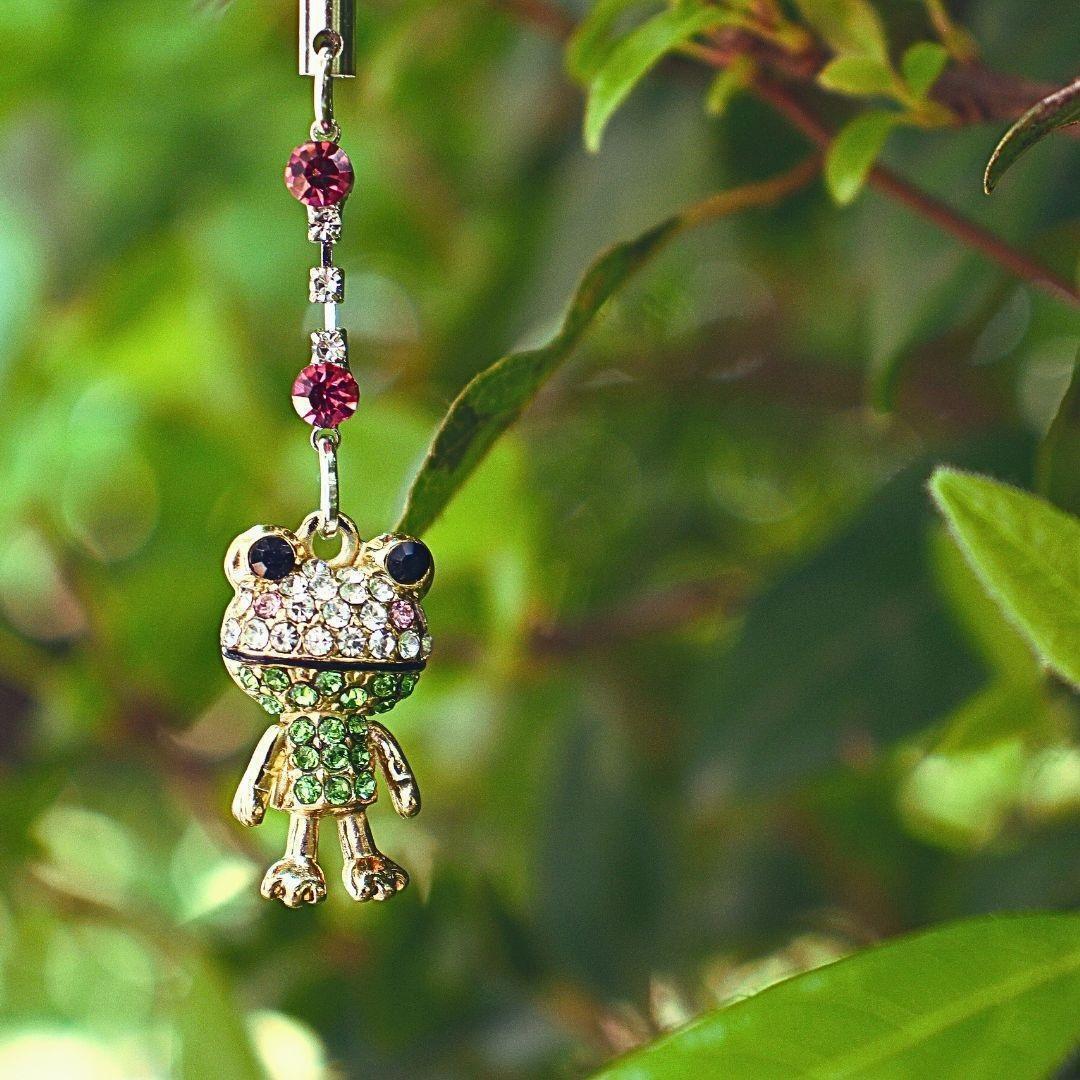 このカエルのキーホルダーは、ユニークな象眼細工のラインストーンと