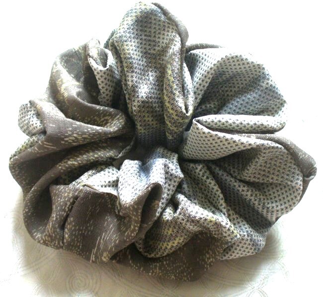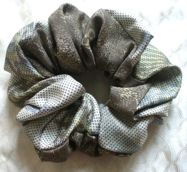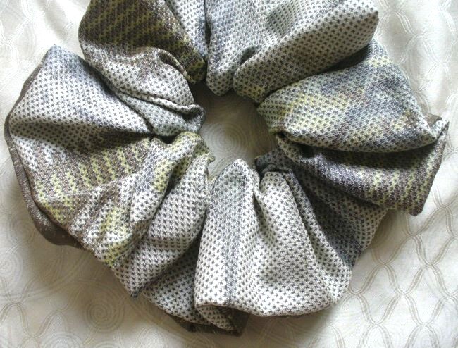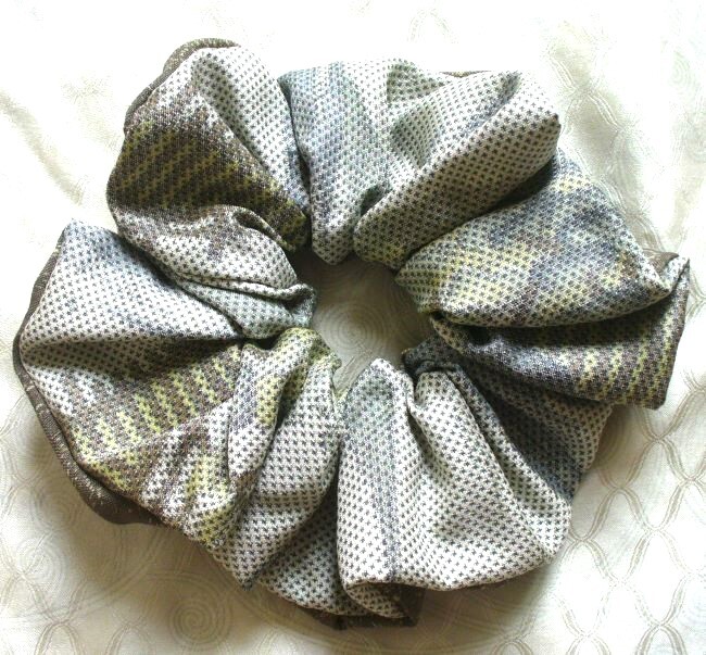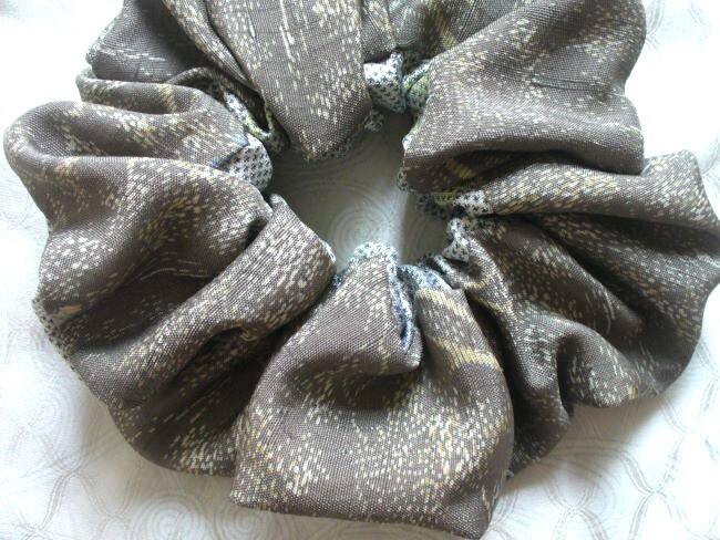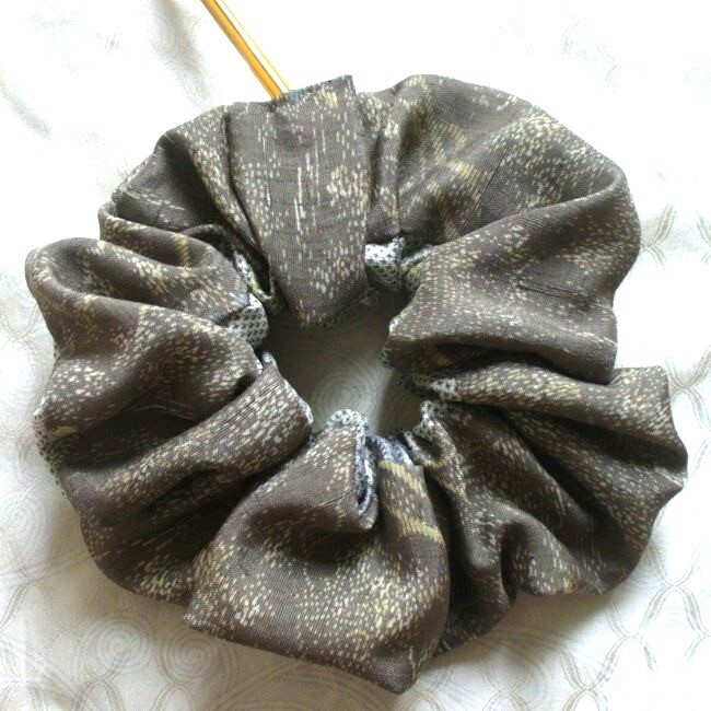 最後 ゴム交換可能 アクセントリバーシブル 茶自然白系 シュシュ 着物リメイク 和柄 手縫い ハンドメイド リメイク 着物 和物