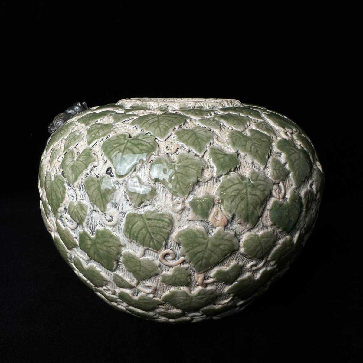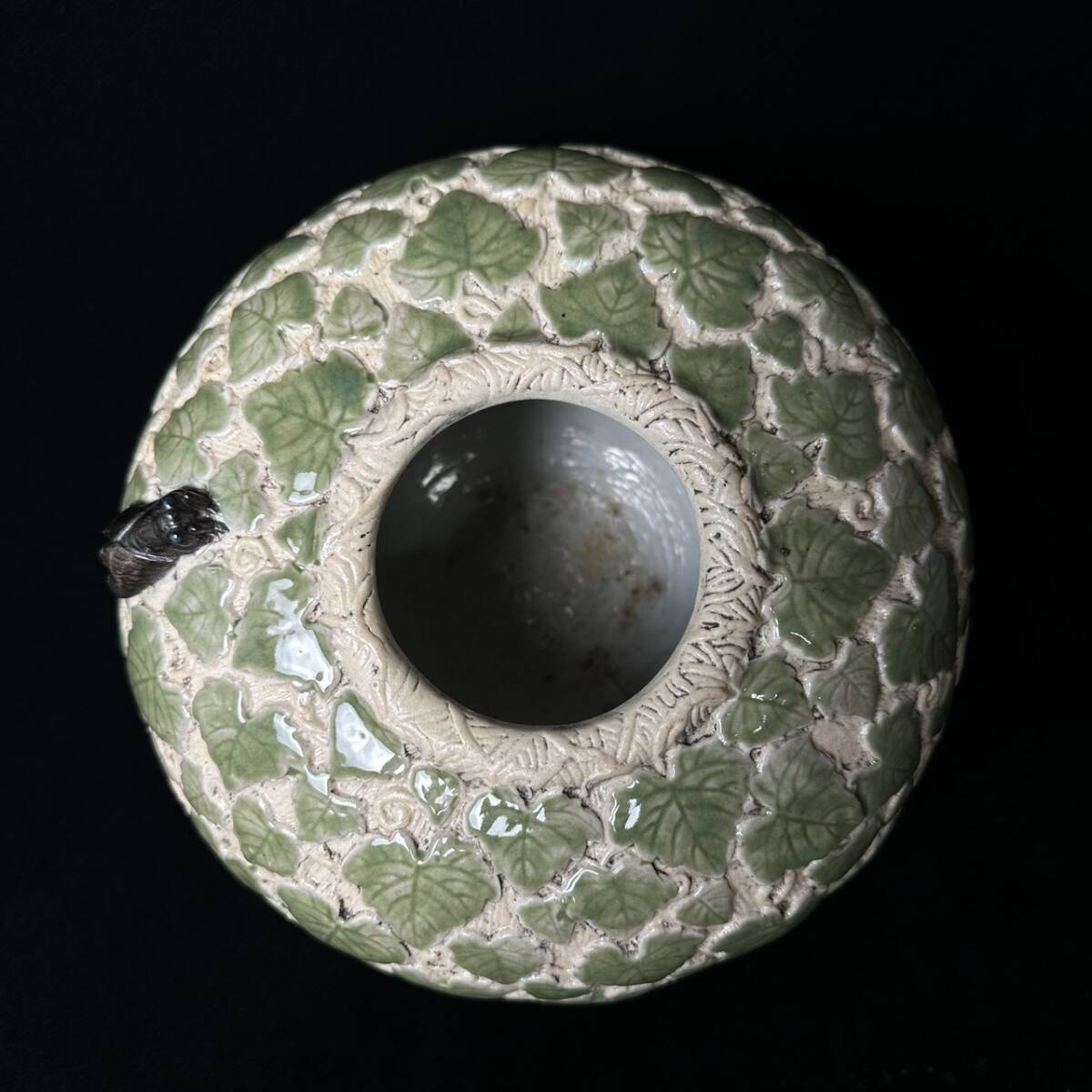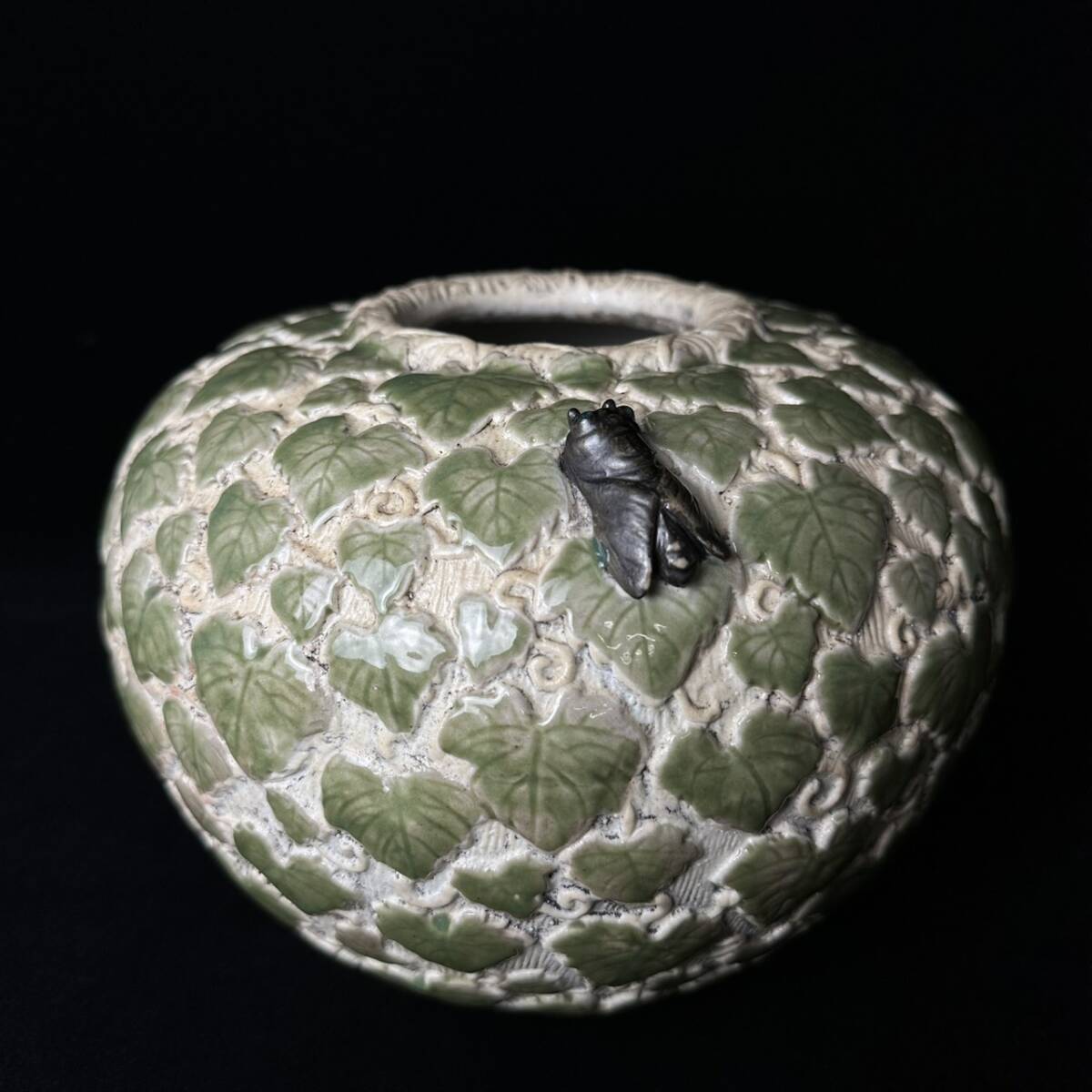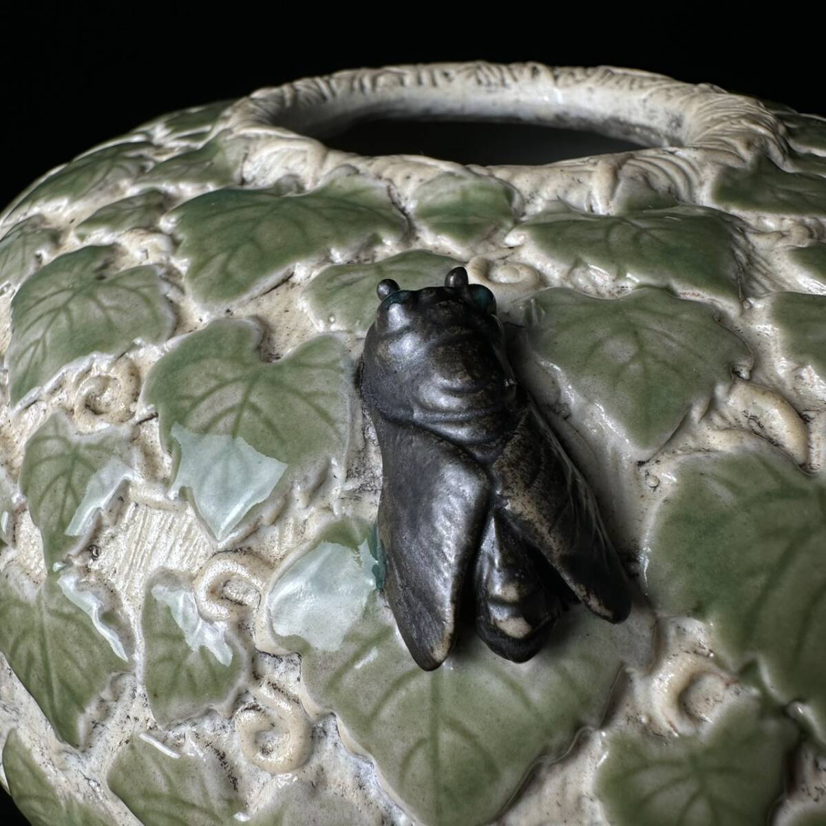 コレクター買取品 京焼 蝉 浮彫花瓶 セミ 昆虫紋 ツルの葉 釉薬 青磁 飾壺 花入 花器 細密彫刻 置物 時代物