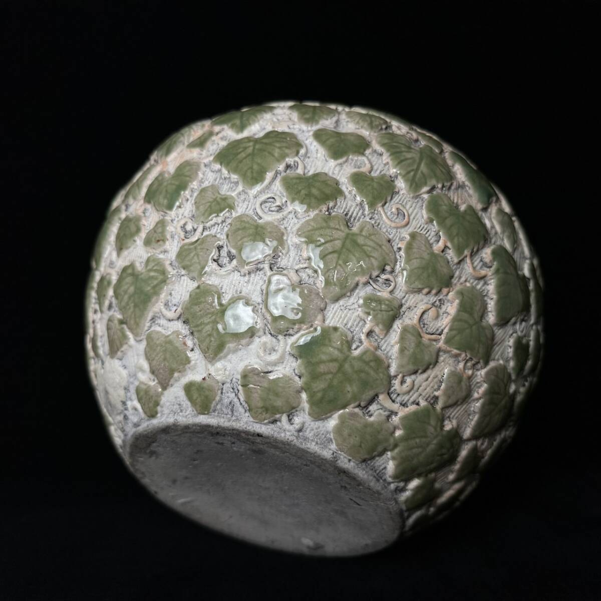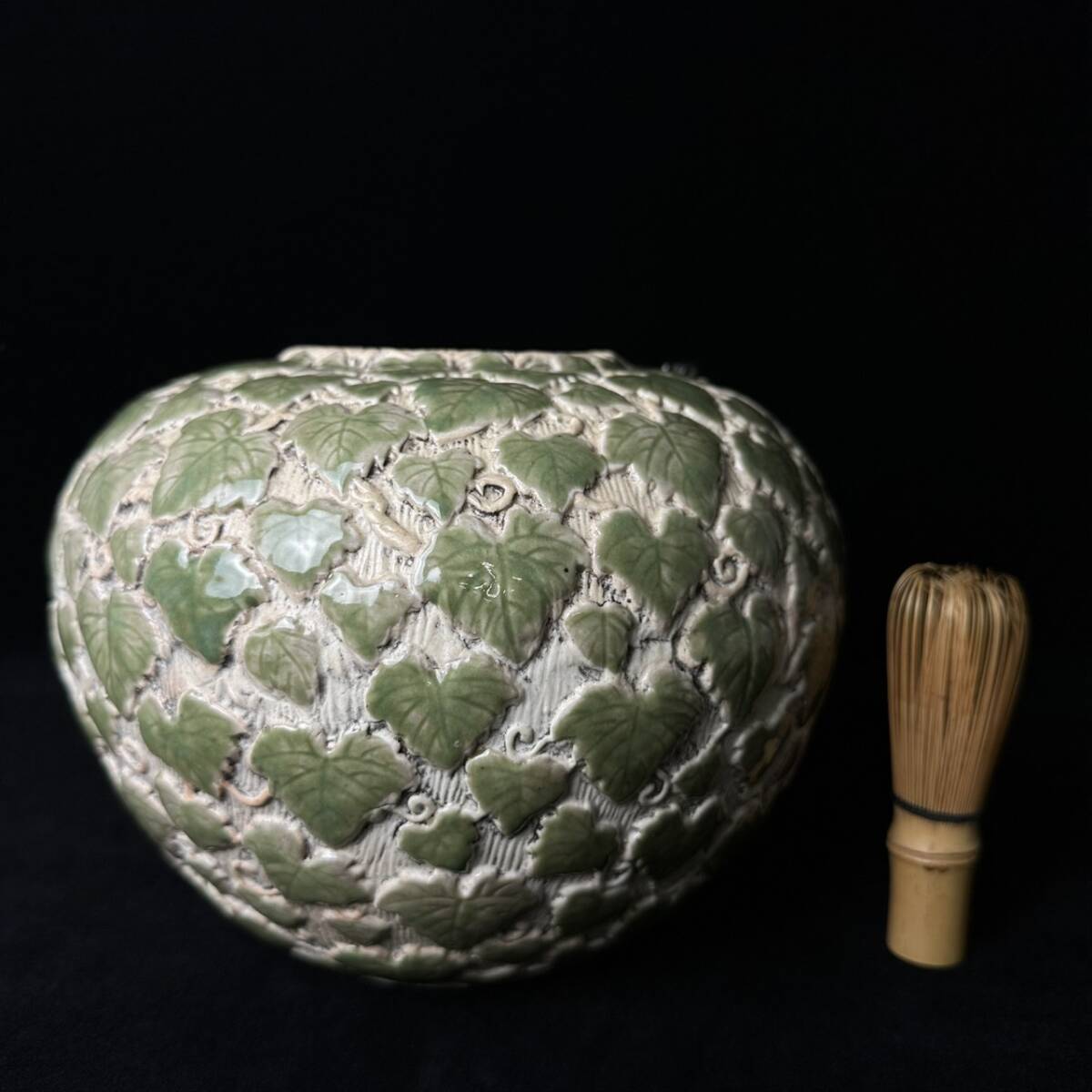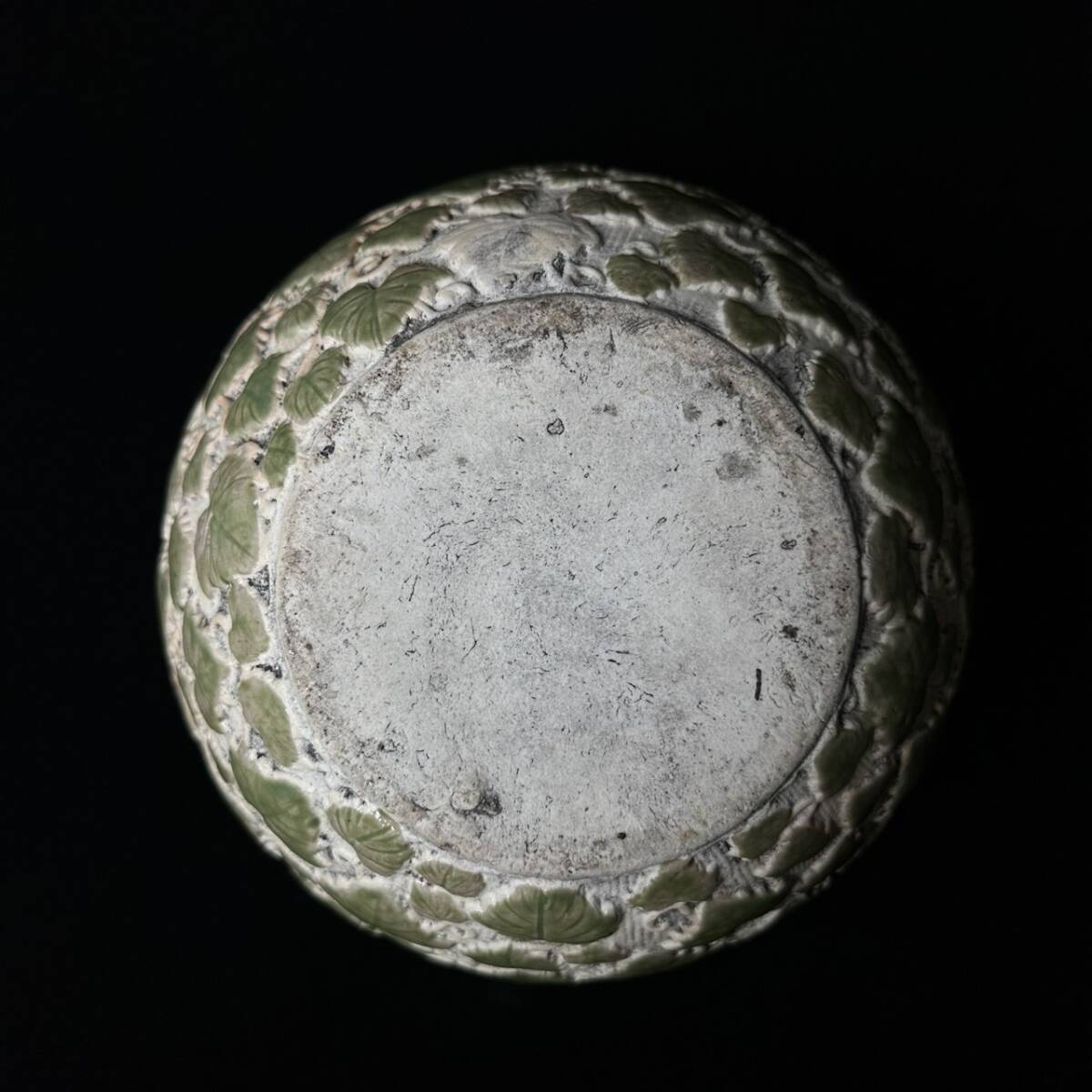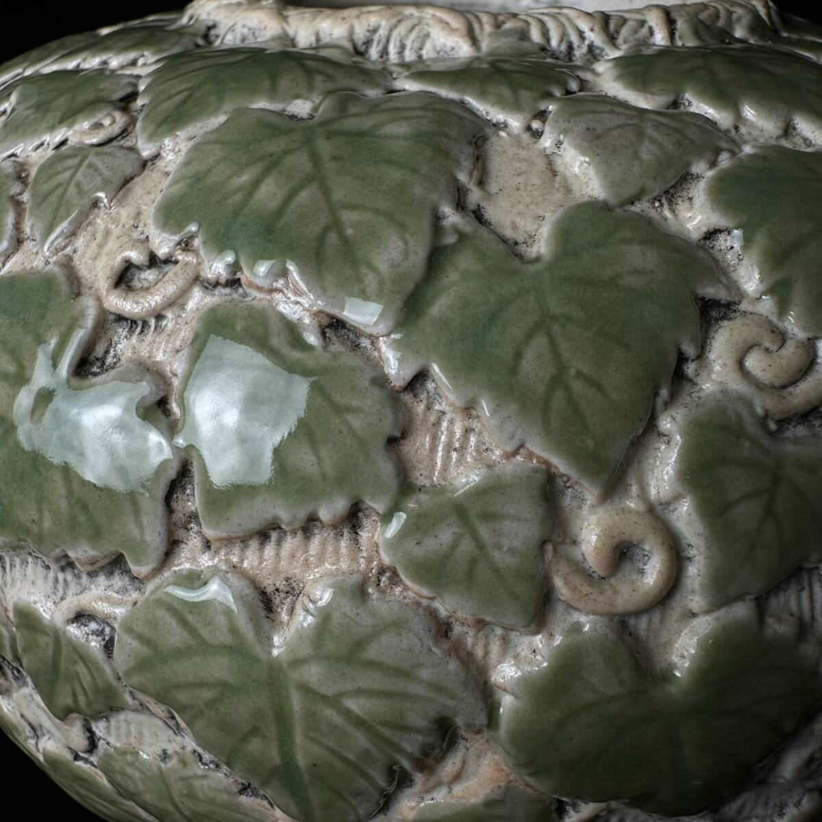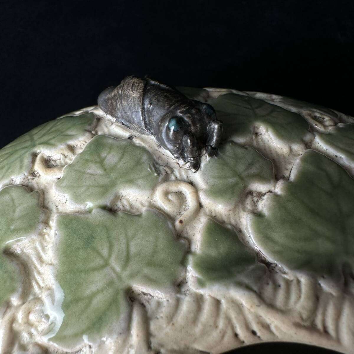 コレクター買取品 京焼 蝉 浮彫花瓶 セミ 昆虫紋 ツルの葉 釉薬 青磁 飾壺 花入 花器 細密彫刻 置物 時代物