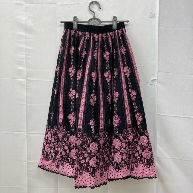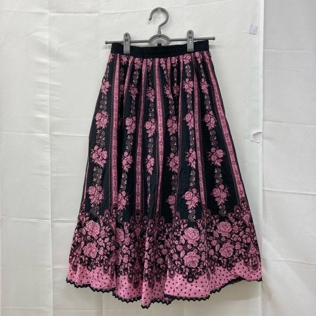 D665 ユーロ古着 40 ウエストゴム ドイツ製 コットン 花柄 フレア スカート ブラック レディース