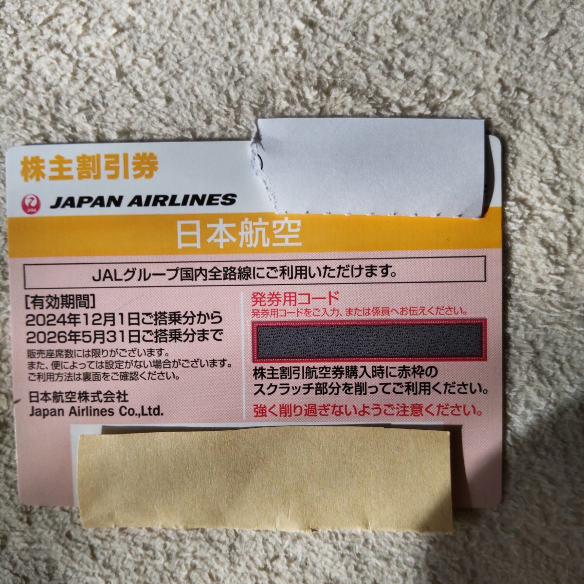 2026年5月31日まで|日本航空|JAL|株主優待券|番号通知のみ|株主割引券