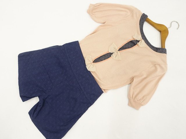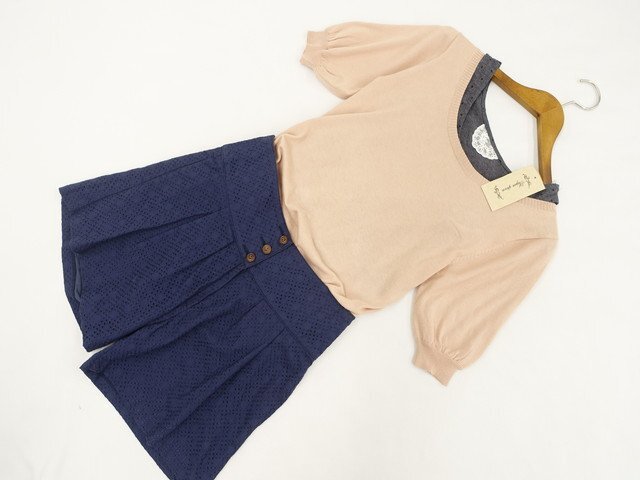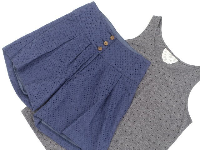 半袖ニットカットソー+タンクトップ+レースキュロットパンツ コーディネート上下3点セット M相当 サーモンピンク/グレー杢地 ブラック ドット柄/ネイビー ガーリー系 20代