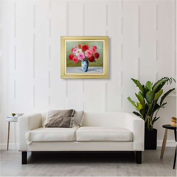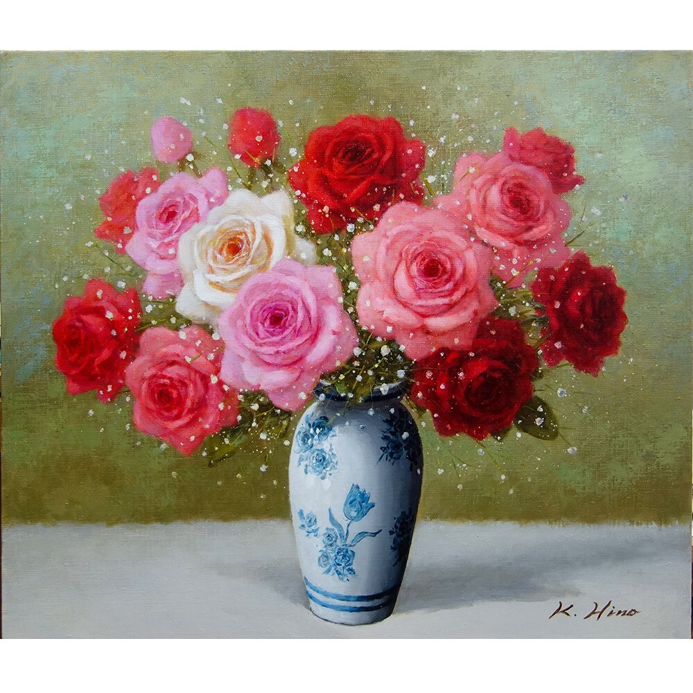 油彩画 F10号 日野皖「ばら」 油絵 真筆 額入り 静物画 肉筆画 手描き 花瓶に花 風水開運 恋愛運UP フェミニン 女性らしさ Y784