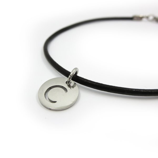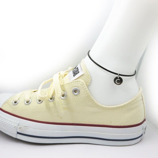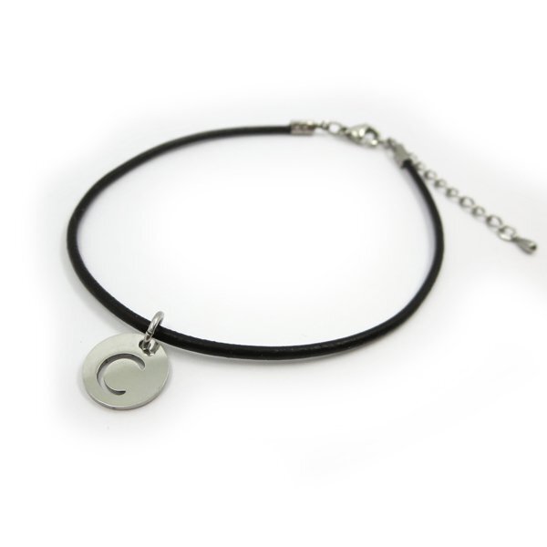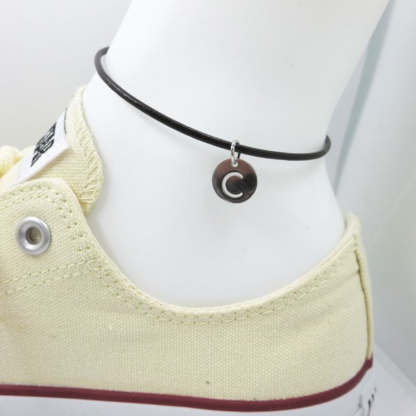 C レザーアンクレット イニシャルチャーム付き ラウンド型 ステンレス金具 26cm(22+4cmアジャスター)