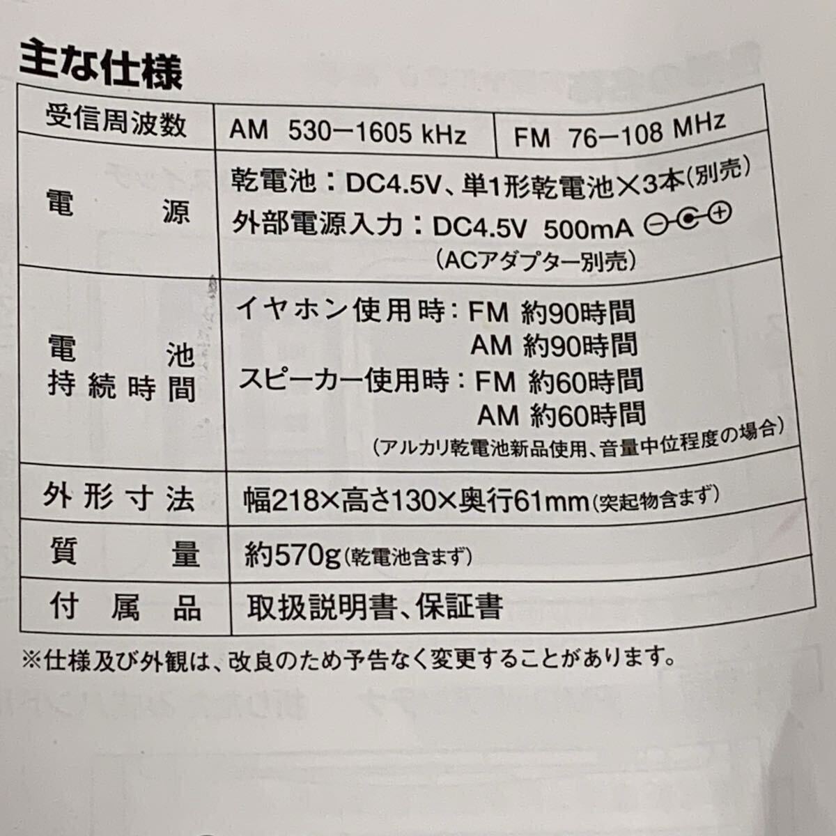 【 仕 様 】◆ 受信周波数:AM530-1605kHz、FM76-108MHz◆ 電源:乾電池DC4.5V、単1形乾電池×3本(別売)外部電源入力DC4.5V 500mA センター+(ACアダプター別売)◆ 電池持続時間:イヤホン使用時FM 約90時間/AM 約90時間、スピーカー使用時FM 約60時間/AM 約60時間(アルカリ乾電池新品使用、音量中程度の場合)